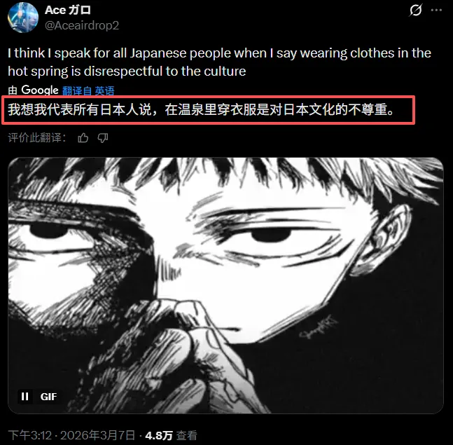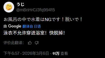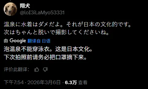 很快便有日本网友跳出来科普,在日本泡温泉,按照习俗是不穿泳衣的,  要裸浴,这是传统,要尊重文化。