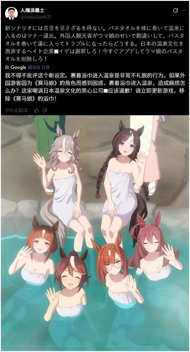 去年《赛马娘》加入了温泉主题的剧情,  马娘们裹着浴巾泡温泉,温泉警察们的要求也是一样的,把浴巾拿掉。