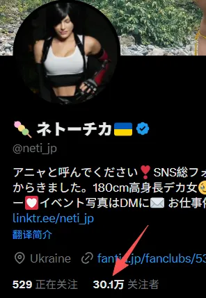 一位在日本活动的乌克兰coser(@neti_jp)火了, 她的条件,天生就适合当网红的组合身高180cm+欧美系骨架,再加上在日本发展的外国人这个标签,简直是算法亲儿子。还没开始运营,流量加成就已经到位了。