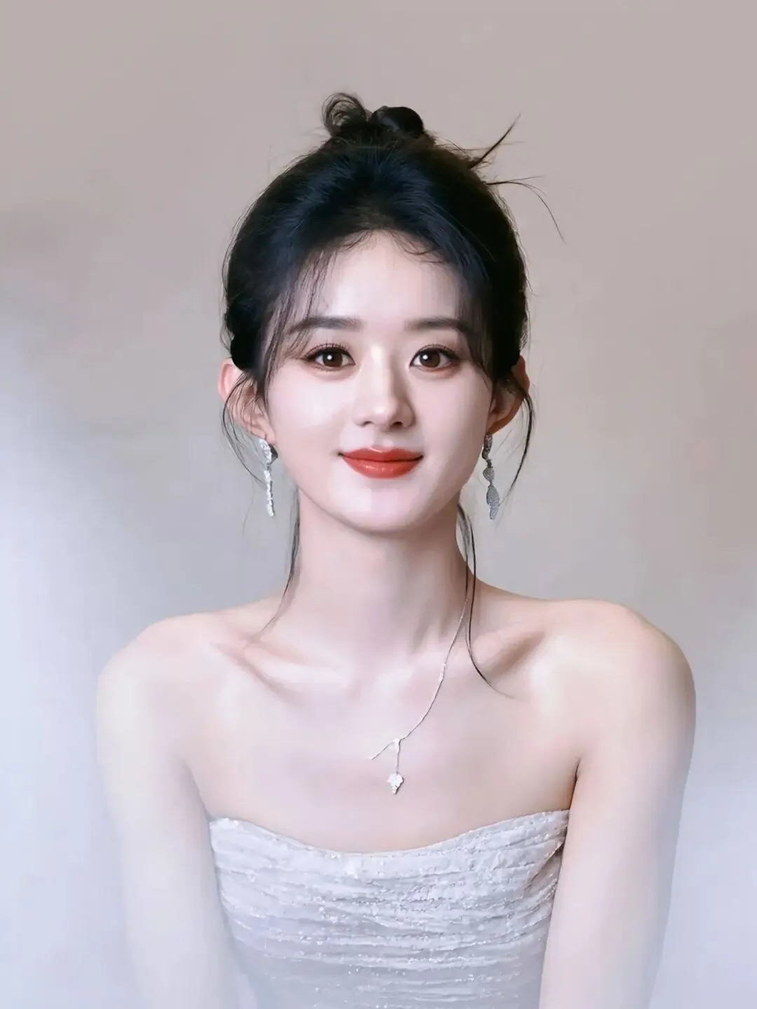 赵丽颖穿着一袭白色抹胸衣裙,脖戴银制项链,她俏脸甜美,明眸善睐,烈焰红唇,乌黑的秀发梳起来,露出白皙的香肩和手臂,肌肤娇嫩如雪,性感魅力猛增!