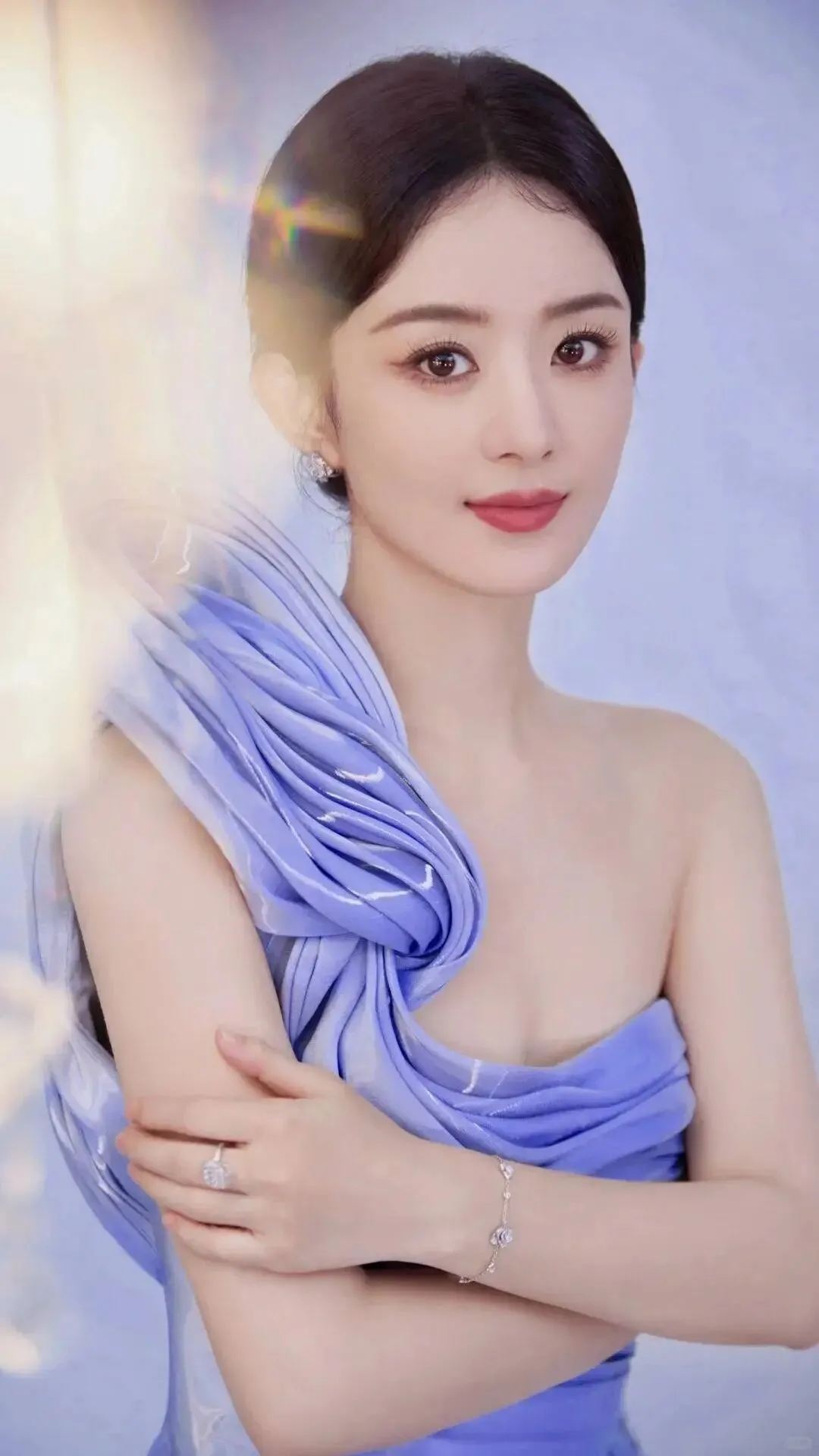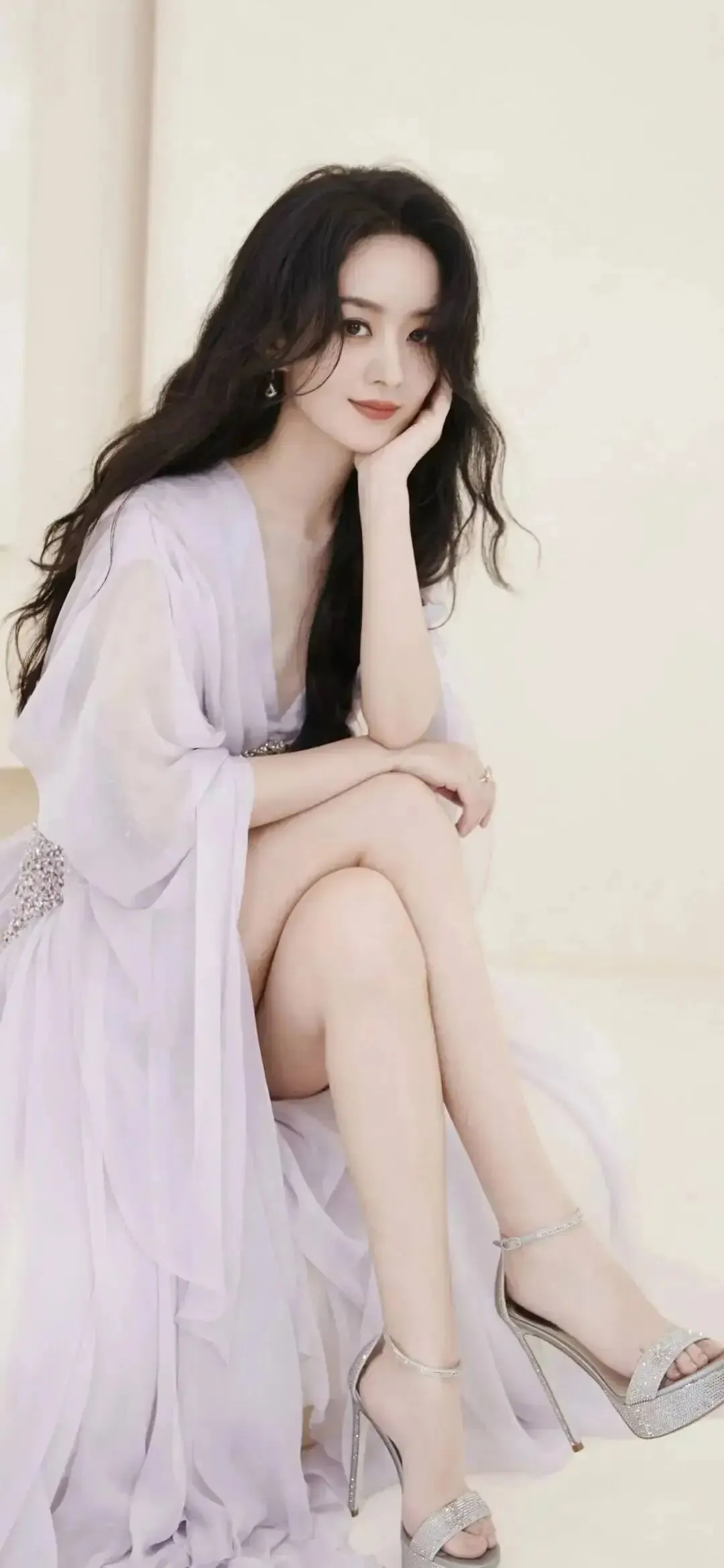 赵丽颖穿着浅紫色纱裙,她俏脸笑容甜美,单手托着脸颊,乌黑的长发飘逸,露出自己的修长的大美腿,性感魅力猛增!