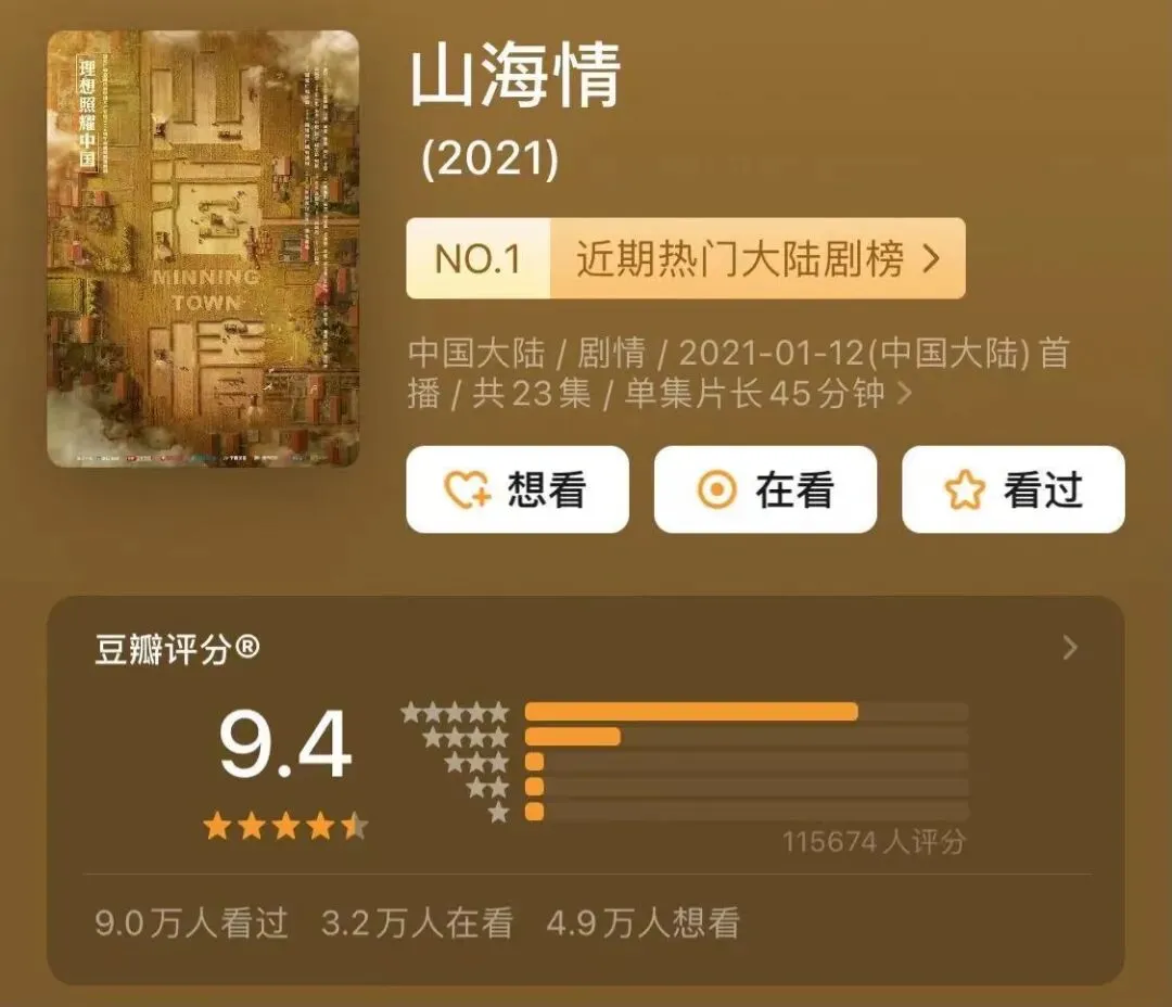 口碑剧《山海情》之前首播结束,在豆瓣拿到了9.4的评分,即将在央视黄金档开始第二轮放映。