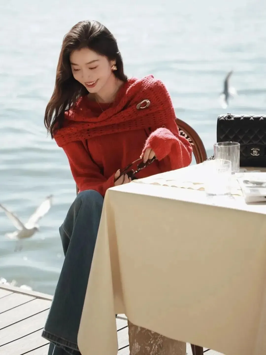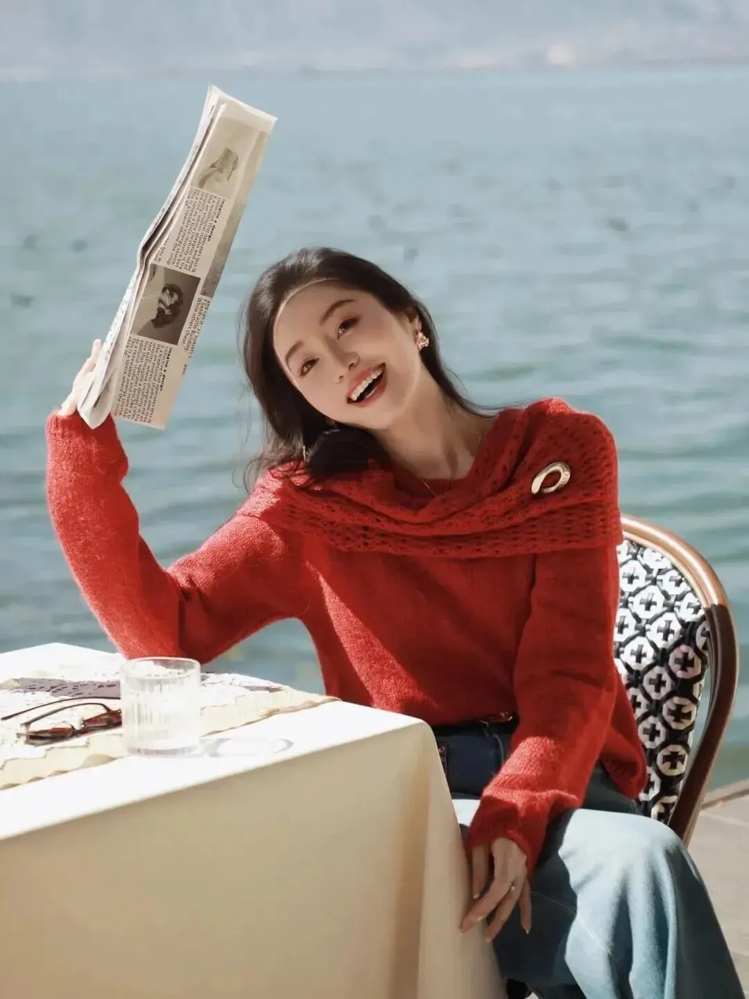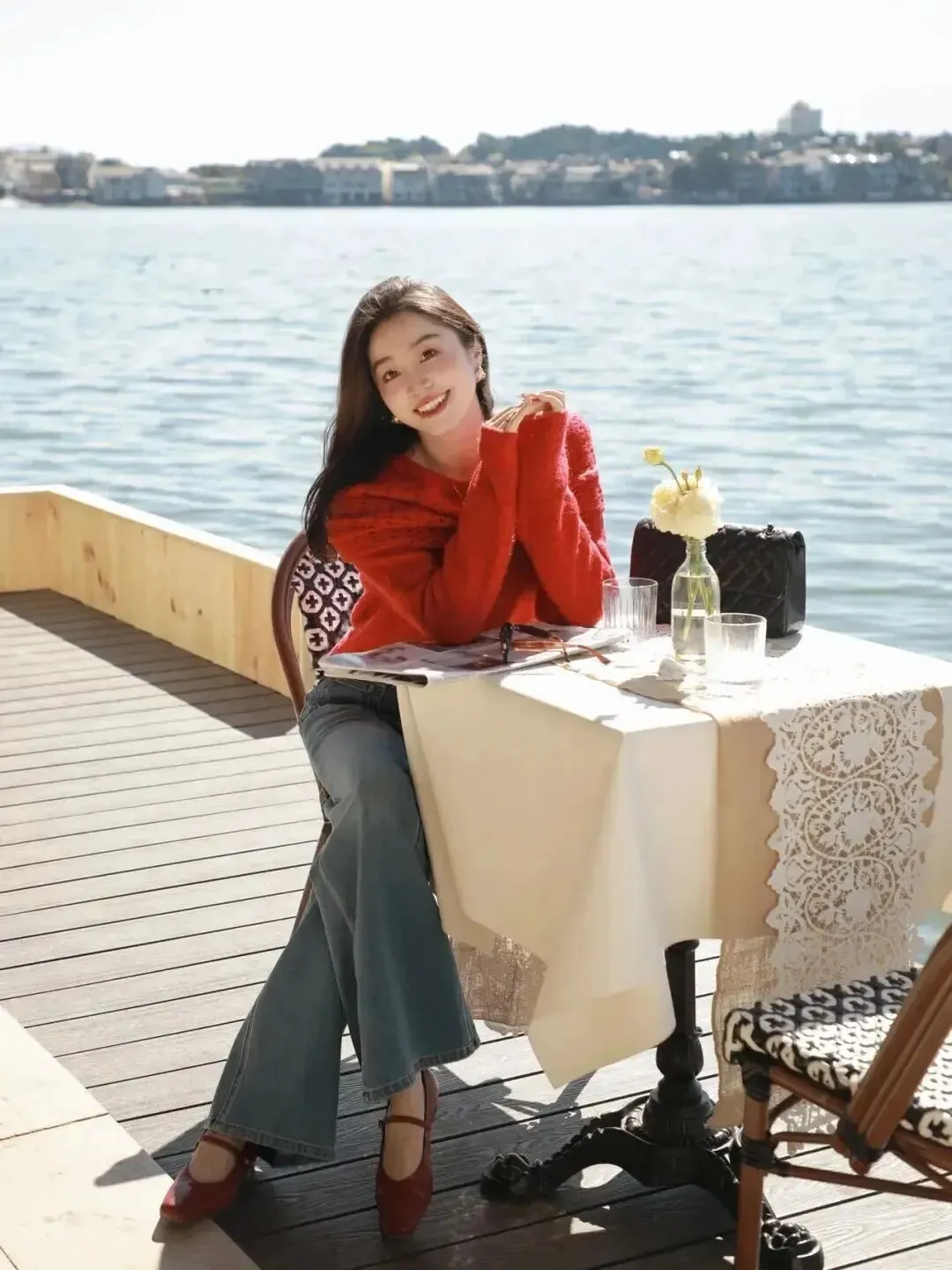 技巧:利用桌子、花瓶当前景,增加画面层次;背景湖水虚化,突出人物主体;眼神看向镜头,带点慵懒的笑意,不用太用力,松弛感就出来了。