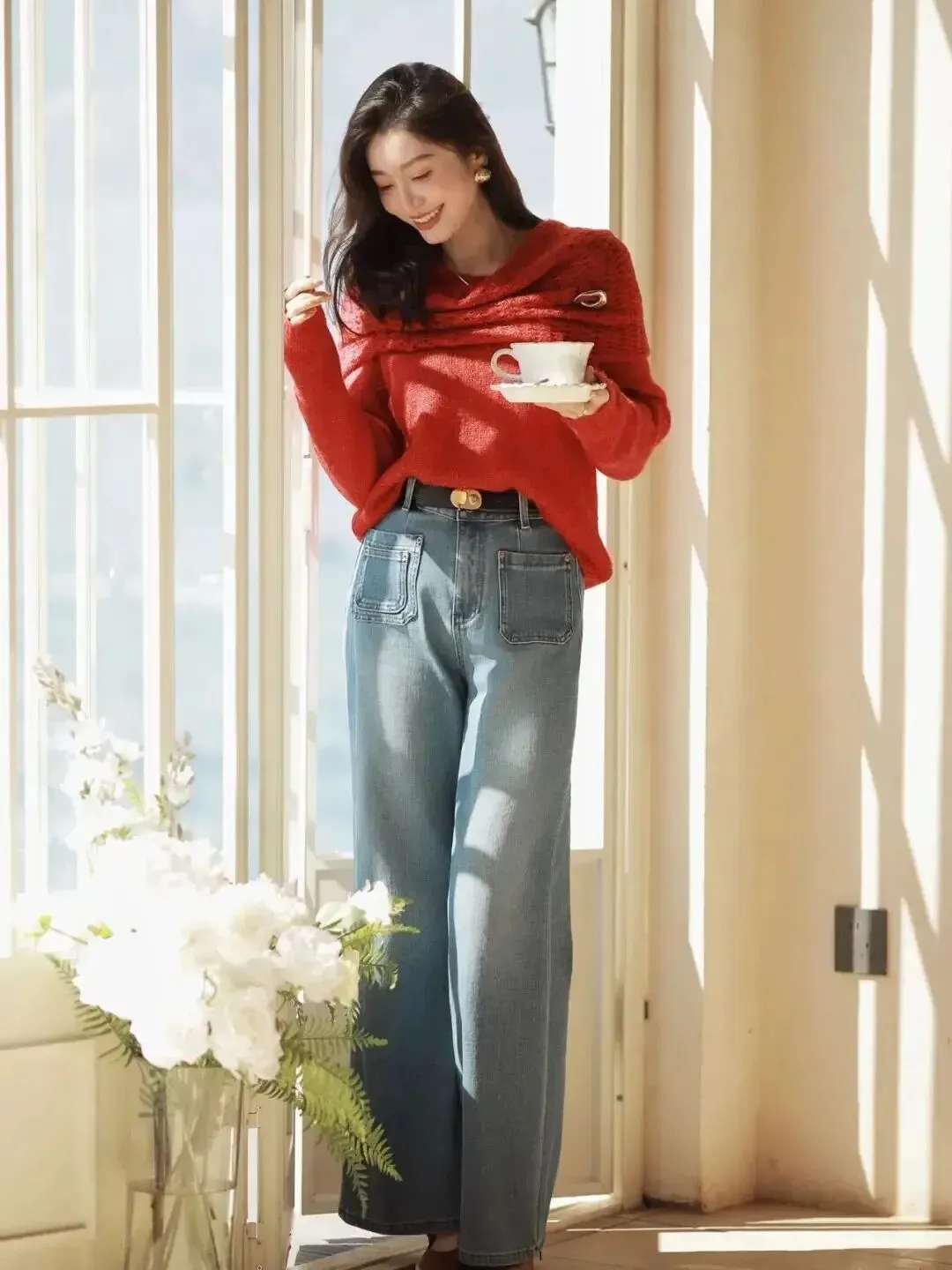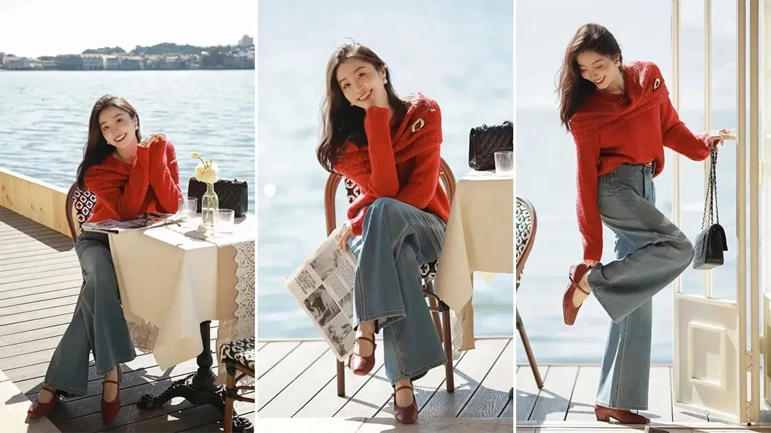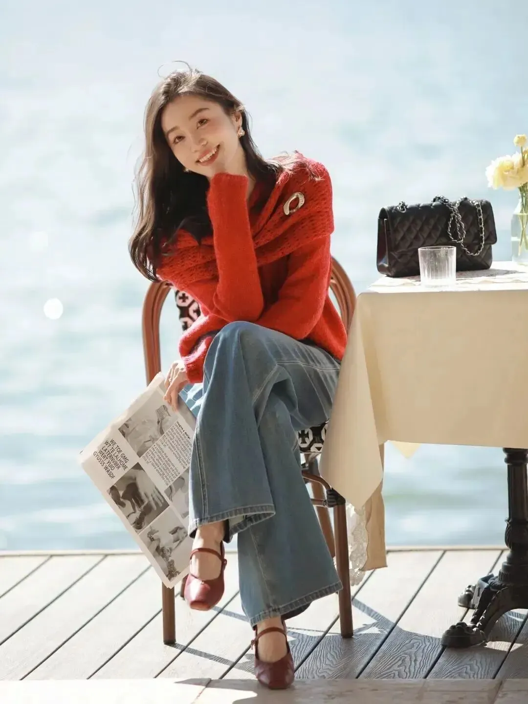 技巧:利用桌子、花瓶当前景,增加画面层次;背景湖水虚化,突出人物主体;眼神看向镜头,带点慵懒的笑意,不用太用力,松弛感就出来了。