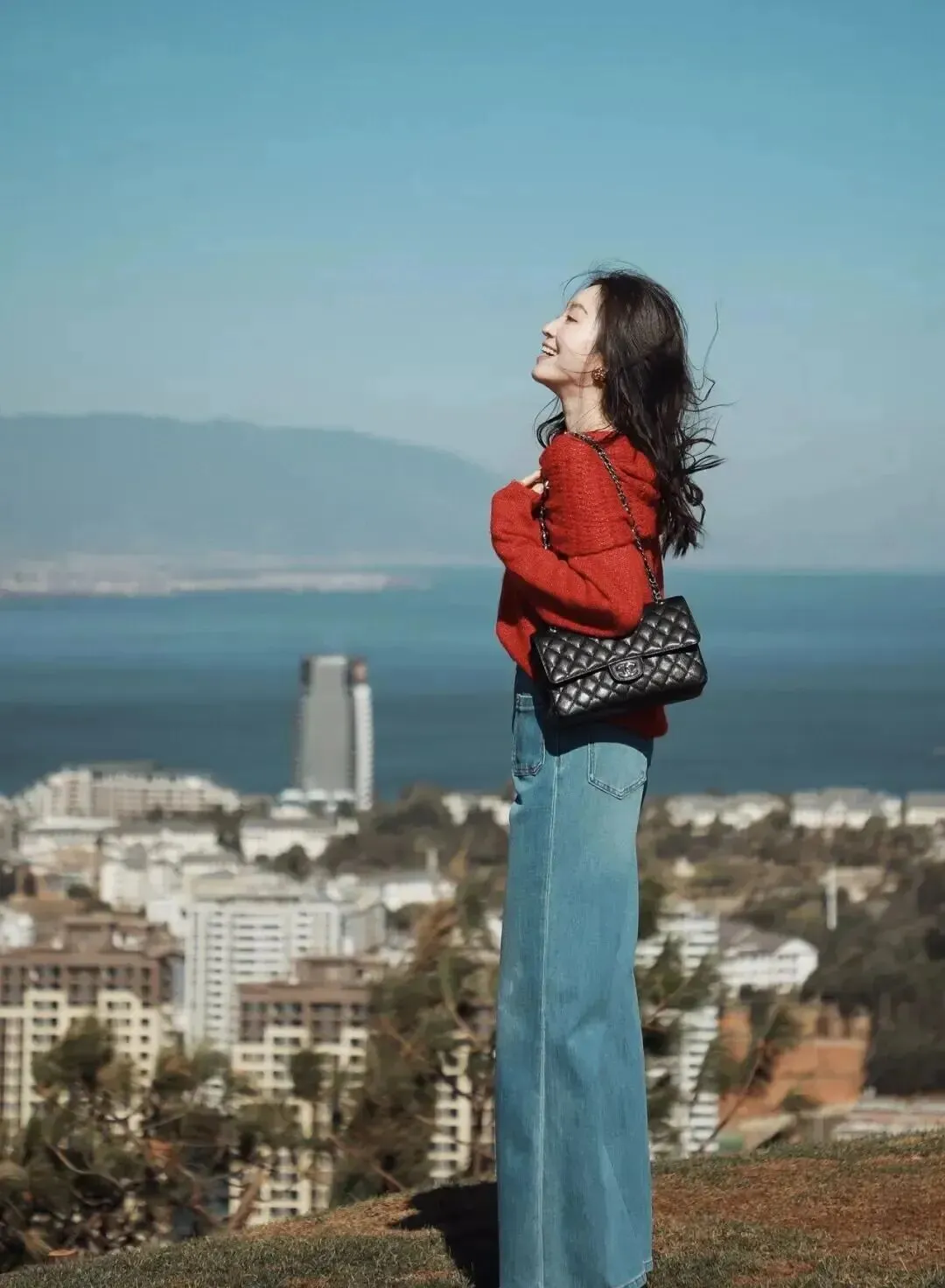 站在高处时,别缩成一团!侧身站立,仰头看向远方,一手轻搭在包带,肩膀打开,让身体线条更舒展。