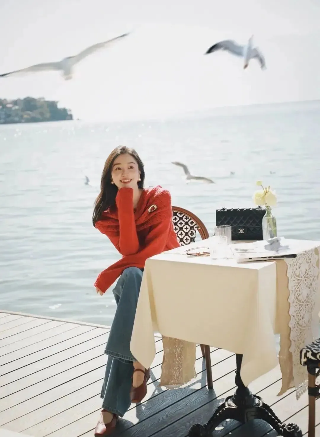 坐在户外时,一手托腮,身体微微侧转,眼神看向镜头,背景是开阔的湖水和飞鸟。