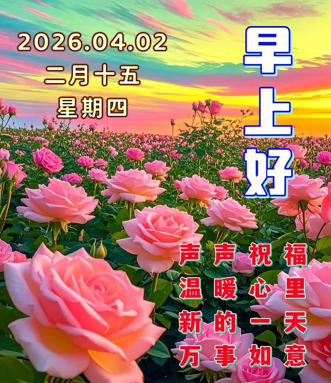 🌅今天是4月2日,🌞春风送暖百花开,🌊好运常伴乐开怀,🌺岁月安然福星照,🌹笑口常开喜事来,💝纵然山水遥相隔,💐牵挂问候情谊在,💕周四愉快!🌈