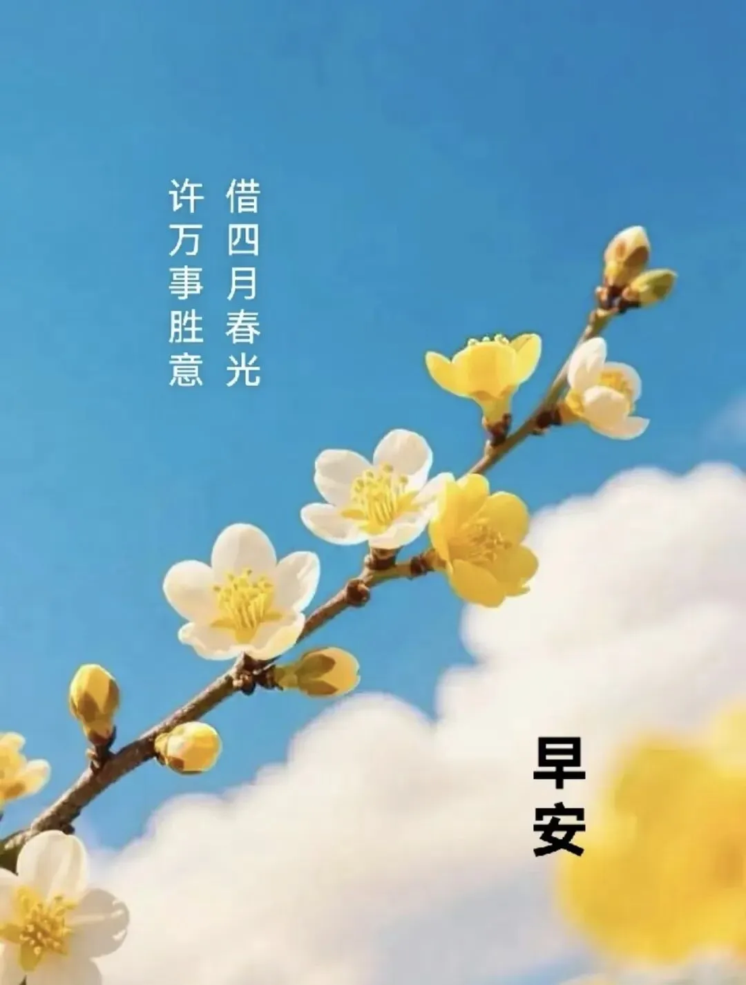 11、清晨问候,送上温暖🌞,四月春光,温柔相伴🌸。愿你烦恼随风而去,幸福如期而至,心情美丽,身体健康,工作顺利,生活甜蜜,元气满满,早安吉祥🌷。