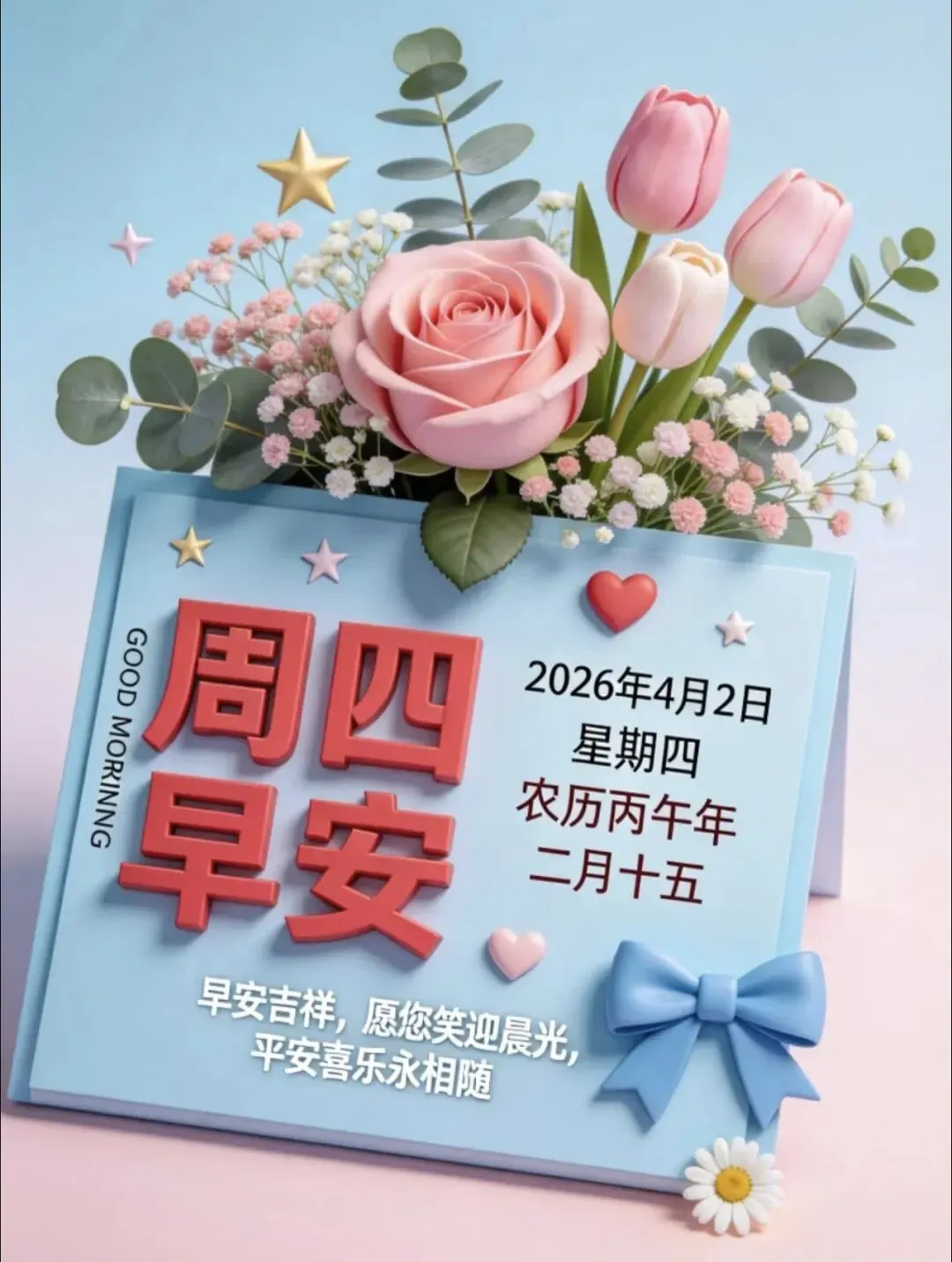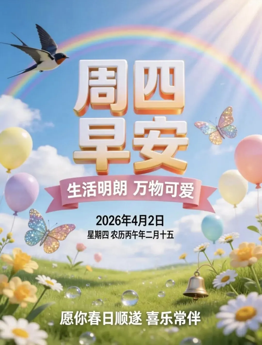 当前位置:首页>美女资讯>4月2日最新周四早安漂亮图片祝福,四月早安温馨祝福语,周四早上好问候祝福语,春天早安祝福语.