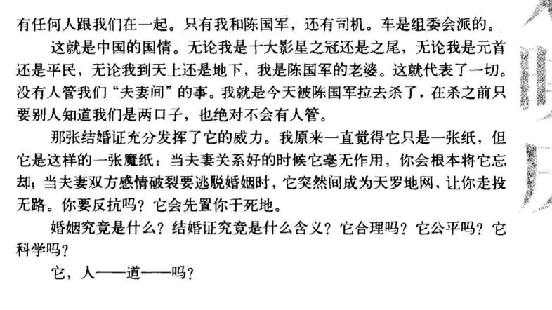 刘晓庆的一生经历了四段婚姻,但她说自己不喜欢结婚,次次都是被逼婚:“为什么要有婚姻呢,一个人不是挺好的。”
