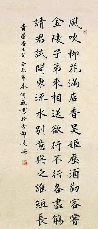 在书法研究方面,何薇参与了《中国书法思想史》《中国历代五体书法精品赏析》(五卷本)《大学书法》《大学书法教程》等学术著作的研究和撰写。尤其对欧阳询,何薇再熟悉不过了,她专门写了28万字的《欧阳询书学思想研究》,所以她的楷书,点画遒劲,棱角分明,方圆兼施,方笔居多,并辅以圆笔,有欧阳询的挺拔险峻,法度缜密,同时又有褚遂良的纤细坚挺。