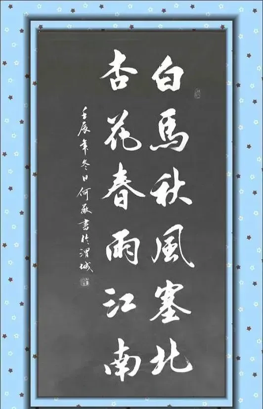 而她的行书,遒美健秀,点画浑厚。笔势含蓄委婉,自然飘逸;结体俊逸秀美,给人赏心悦目的感觉;源于她美术学的功底,对于线条的把握也非常好,粗细的对比给人一种视觉上的冲击和吸引。有人认为她的书法气韵丰满,骨力尽现,当属“依书呈心怀的正品”,正如她娇美而庄重的容颜一样,秀丽典雅,苍润灵动,刚柔并济。