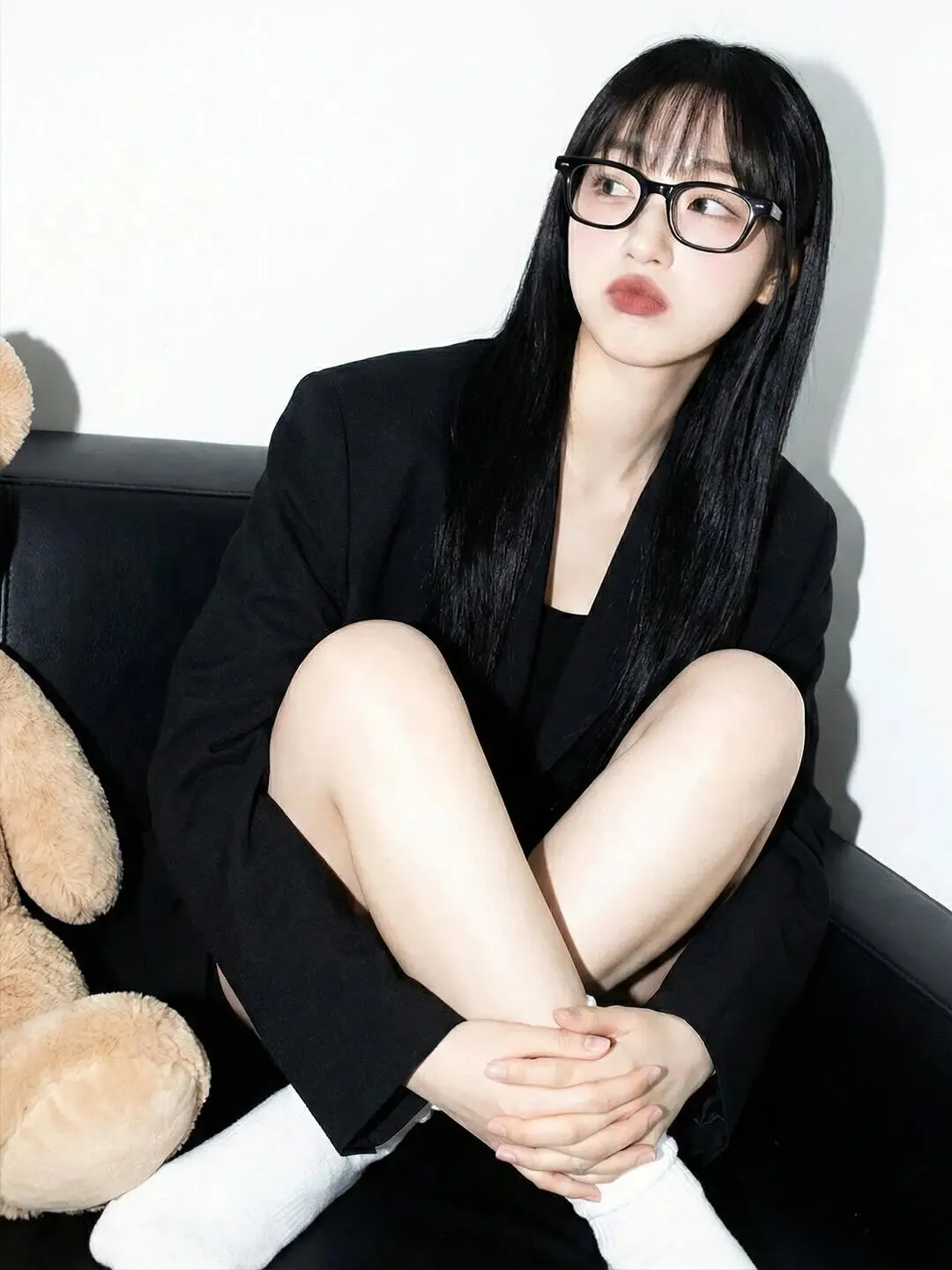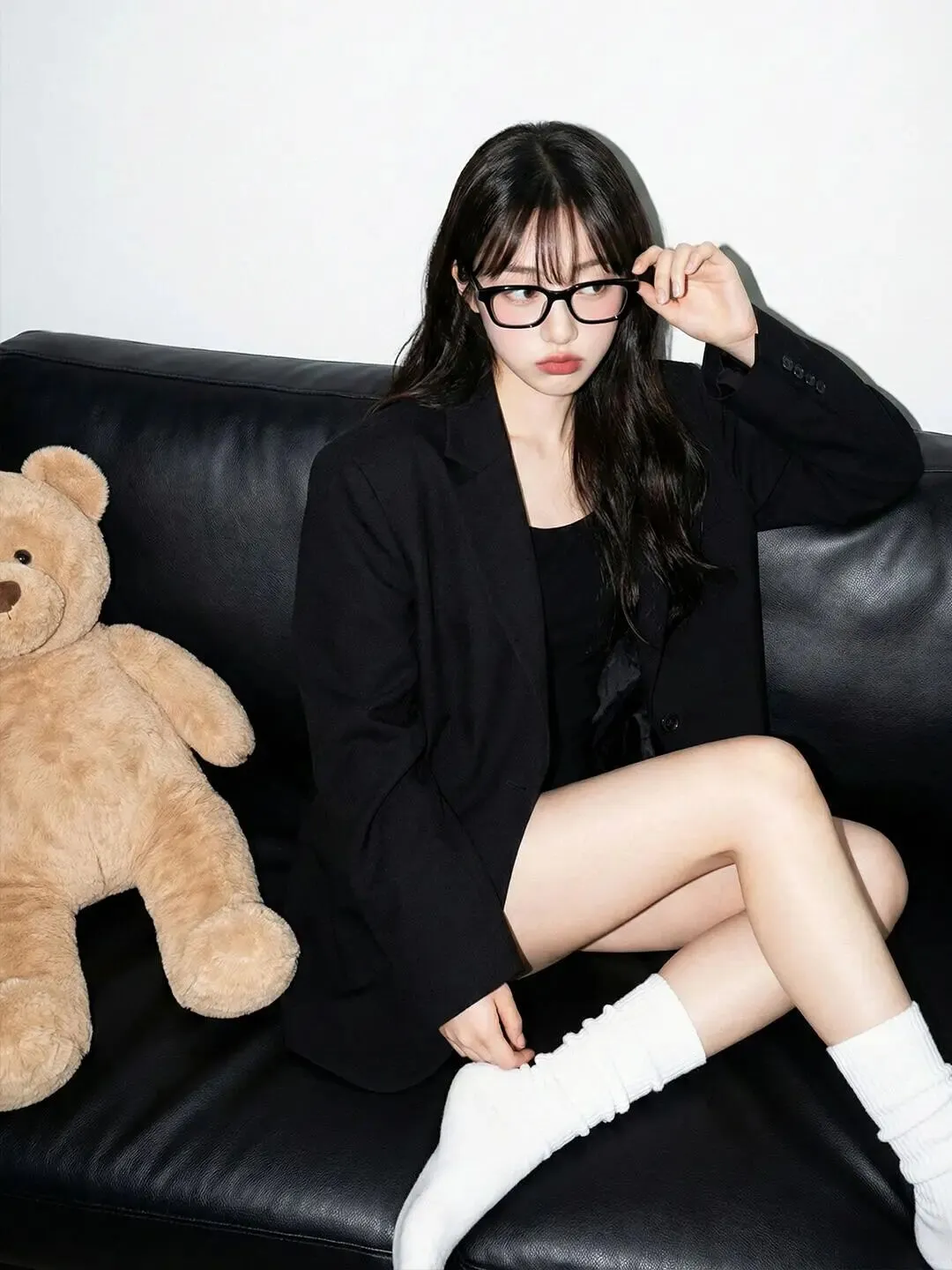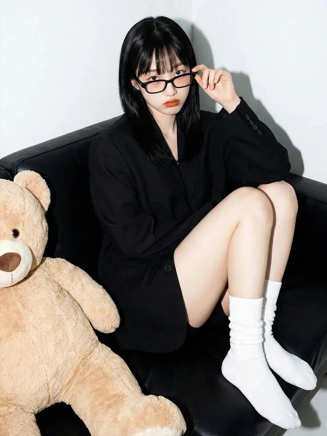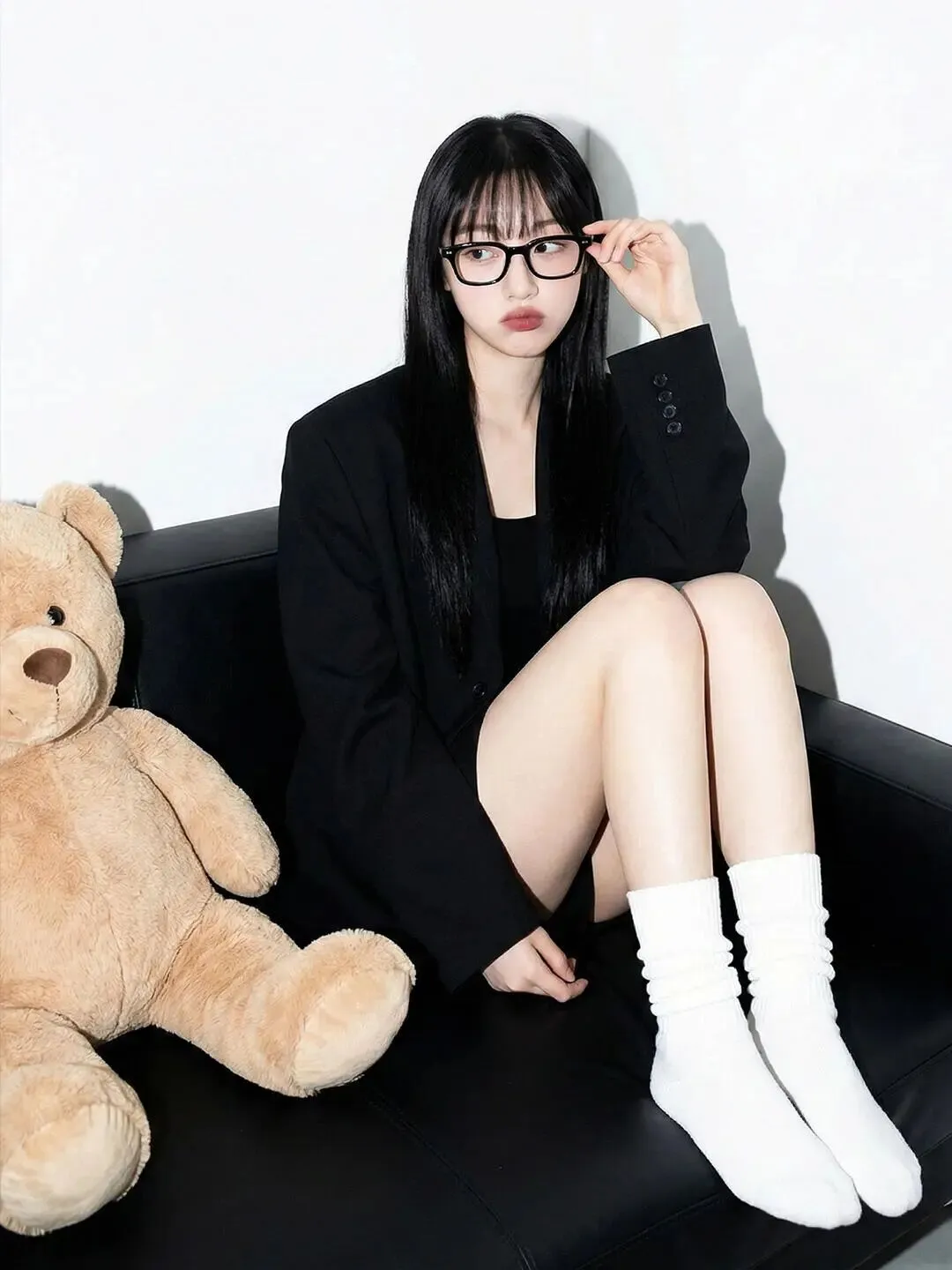 身着Oversize版型黑色西装外套,剪裁挺括、肩部线条硬朗,打造“下衣失踪”流行穿搭风格,内搭极简黑色打底。佩戴一副黑色矩形眼镜,脚踩纯白色棉质堆堆袜,褶皱纹理丰富,包裹脚踝,既提亮下半身视觉,又强调腿部修长与白皙。