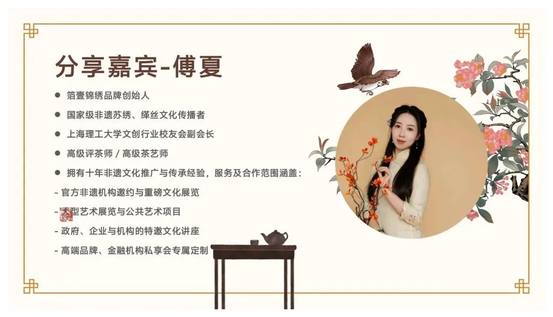 同时,曾艳女士向现场嘉宾介绍,金雅台可提供王法万老师木活字木雕、家族族谱等定制服务与教学,以及提供傅夏老师的非遗织绣文化艺术品鉴与定制咨询服务,为高净值客户打造兼具文化收藏价值与现代礼赠需求的一站式非遗解决方案