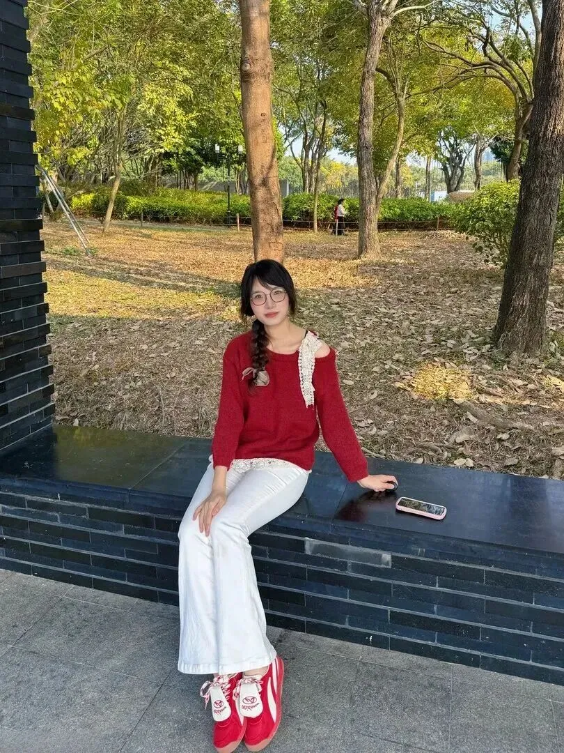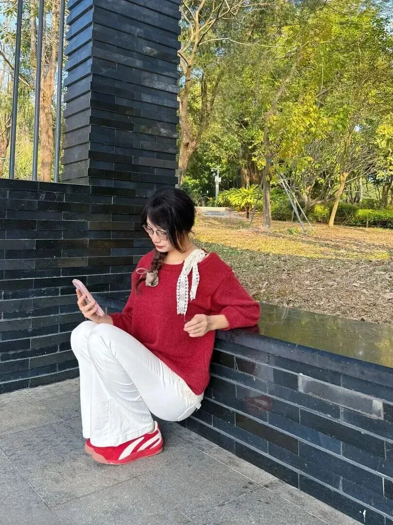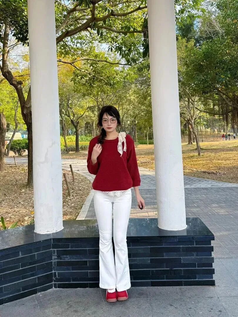 领口和下摆加了蕾丝花边,精美的效果就出来了。穿白色的微喇长裤和酒红色平底鞋站在公园小路上拍照,十分出风头。博主将长发编成麻花辫,戴上了圆头圆脑的眼镜,看起来十分有书卷气,很适合喜欢文艺风的女生日常生活中穿着。