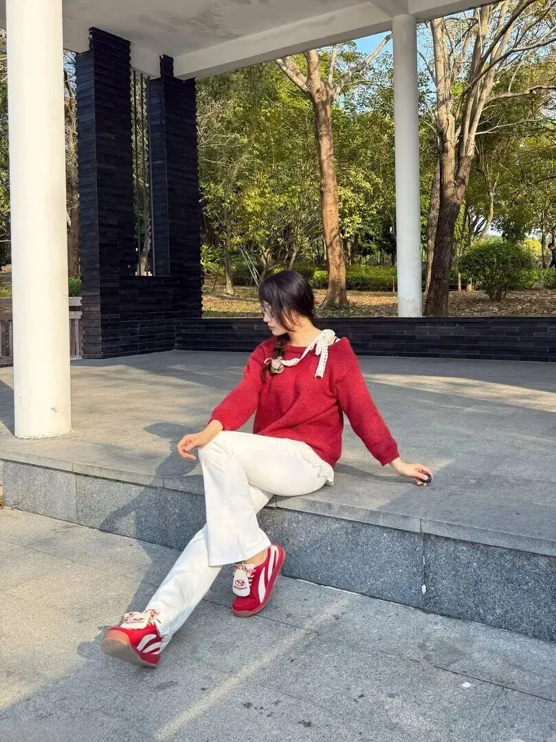 鞋子上红白拼色款是点睛之笔。运动鞋、德训鞋、平底鞋任意挑选一个即可,颜色同毛衣相配即视风格,整体效果好,有时尚感觉。