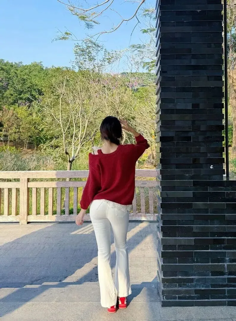 高腰设计拉高腰线、微喇裤型藏肉显瘦,小个子或者梨形身材都可以穿着。穿红白间杂毛衣时可配以酒红色外套、裤子等就不会出错了。