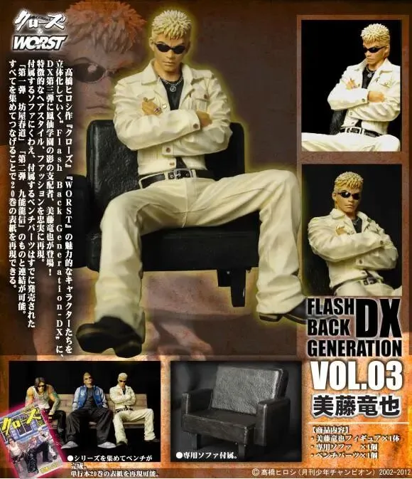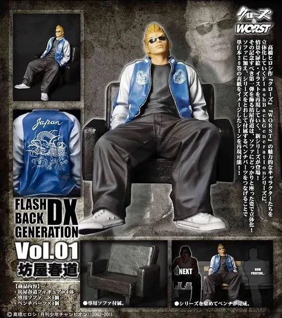 这是Dive在FBG系列基础之上推出的高端收藏系列,和FBG系列同一比例,但可惜只推出过三款产品,忠实地再现了漫画原场景和扉页原画,除人物角色本体之外,还额外附带了单人沙发,长椅等配件,收集齐这三款可以将长椅拼接在一起,再将人物并排摆放,就可以再现20卷的封面图。“第一弹-坊屋春道”、“第二弹-九能龙信”、“第三弹-美藤龙也”