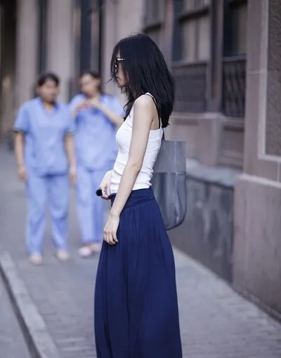 姐妹们是不是也总觉得:别人穿长裙是仙女,自己穿就是乡村女团?我以前超级怕长裙,尤其是那种度假风的,生怕一穿出门就被说“装”。可是自从看到解解这套,真的彻底被颠覆。看看她,简单基础背心搭蓝色飘逸长裙,背一个随性的灰色帆布包,随便一站就有种“我就该这么酷”的感觉