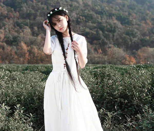 我最最想说的就是这条白裙。每次看到模特穿白裙,就像是动画片里走出来的精灵一样,自然灵动,美得不像话。现实中咱们穿白裙,总担心“显胖”、“显矮”、“发黄”,还有夏天闷热…结果解解这一身,细腰飘带、浅浅的花环发饰,再加上绿野山野做背景,气质直接爆表