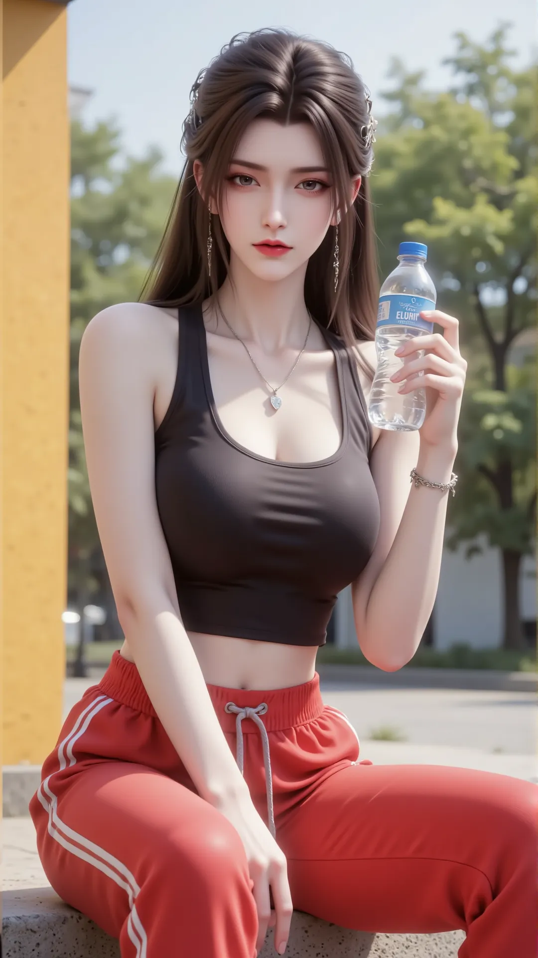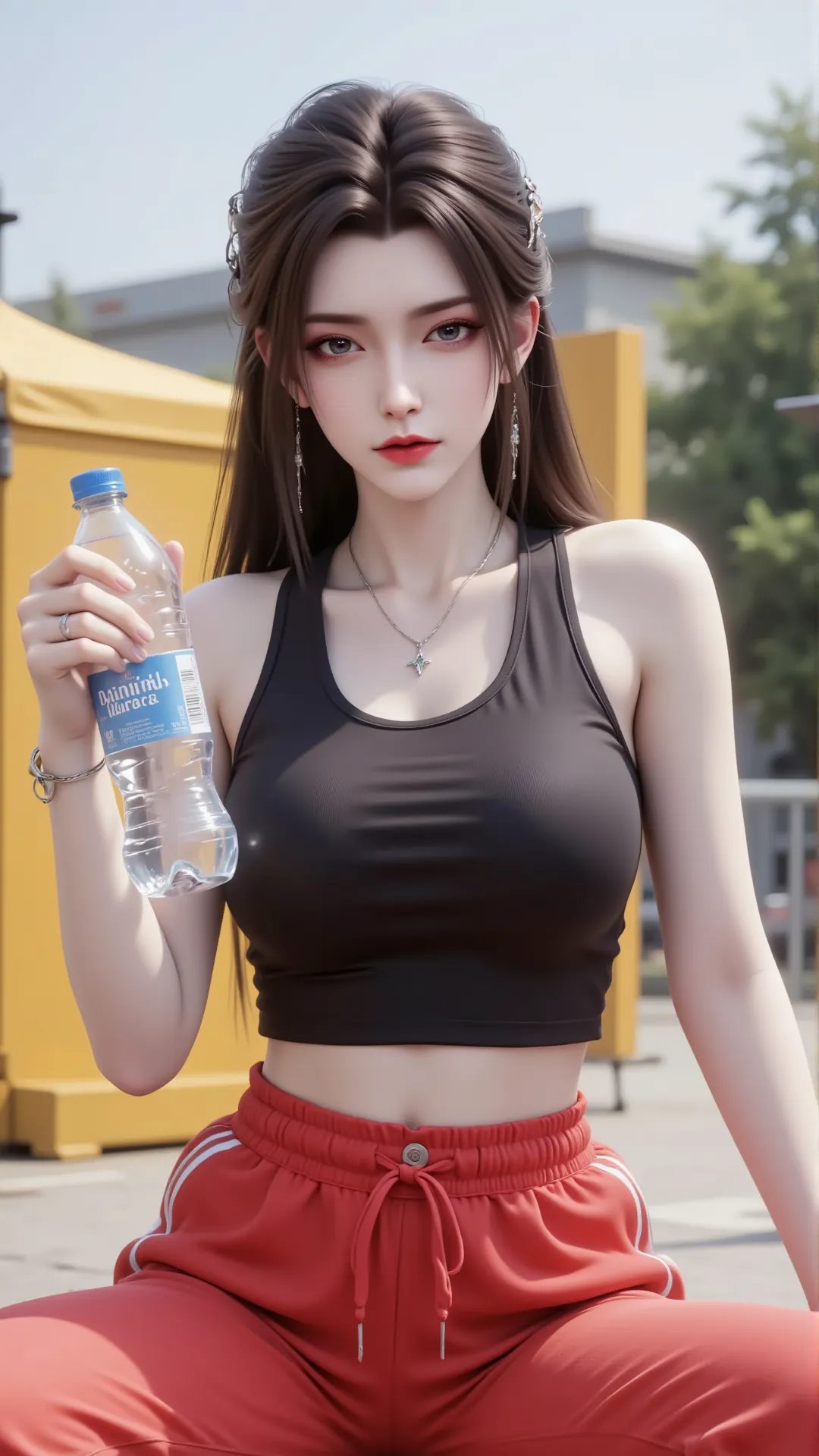 晴光漫过檐角,暖风轻拂玉容,陆雪琪静坐阶前,恍若青云仙娥卸剑归尘。玄色挂肩短衫衬得雪肌胜玉,腰腹线条如琢如磨;朱红运动裤勾勒利落身段,长发高束,银饰发簪轻摇,漾出细碎流光。她手执清瓶,指尖轻握瓶身,那双眼眸,是淬了寒星的琉璃,藏着青云门的清冷孤高,又含着人间烟火的温柔缱绻,一眼望去,便叫阶下生色,草木含情。