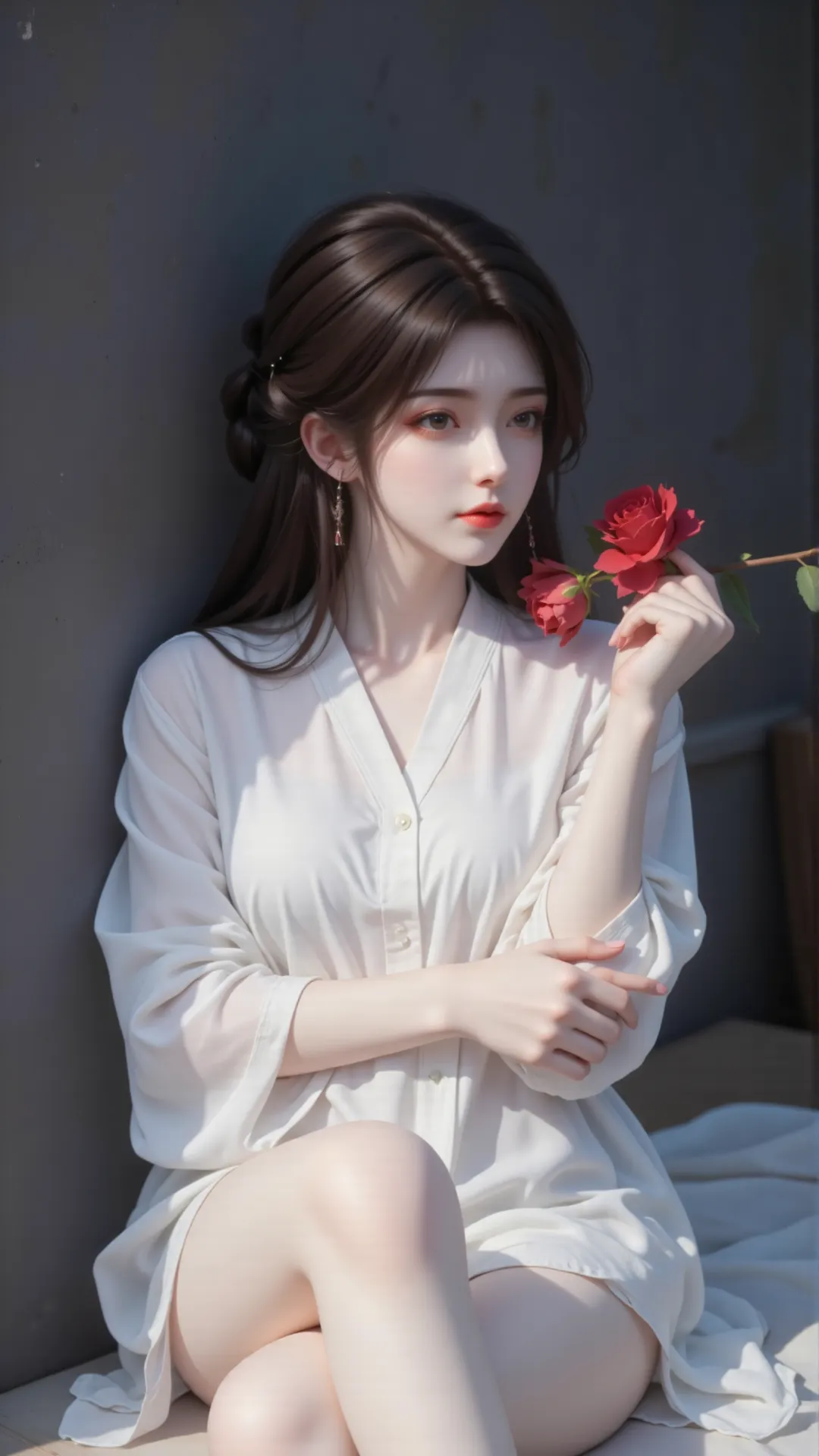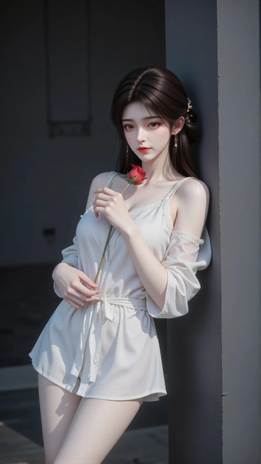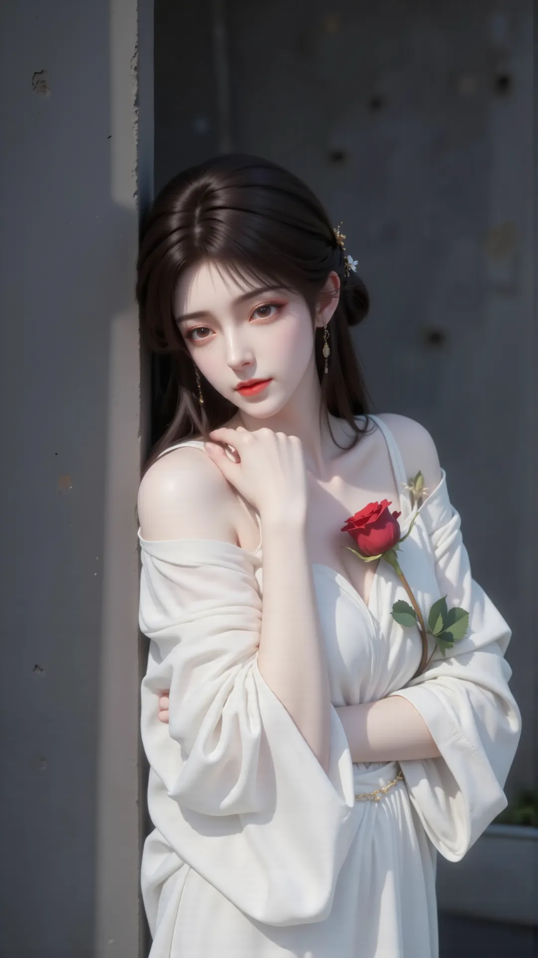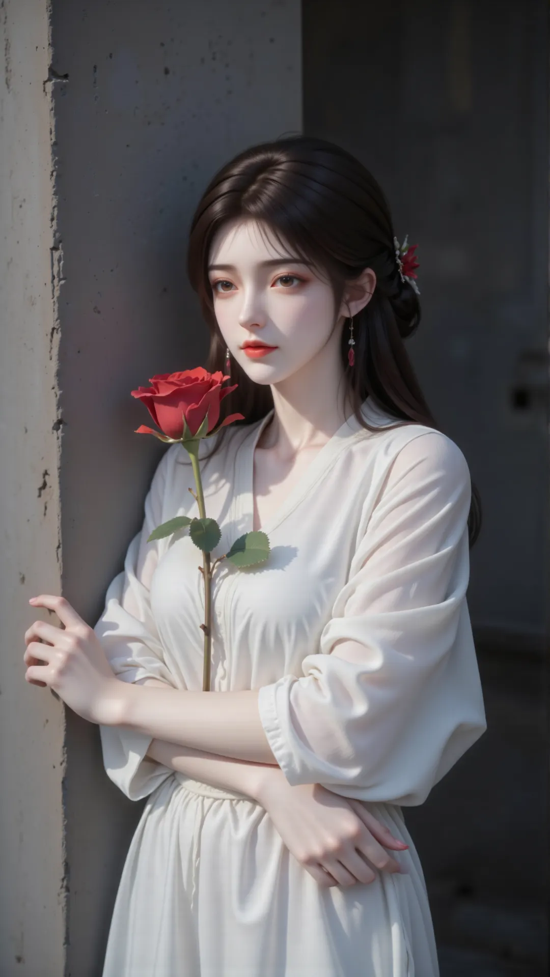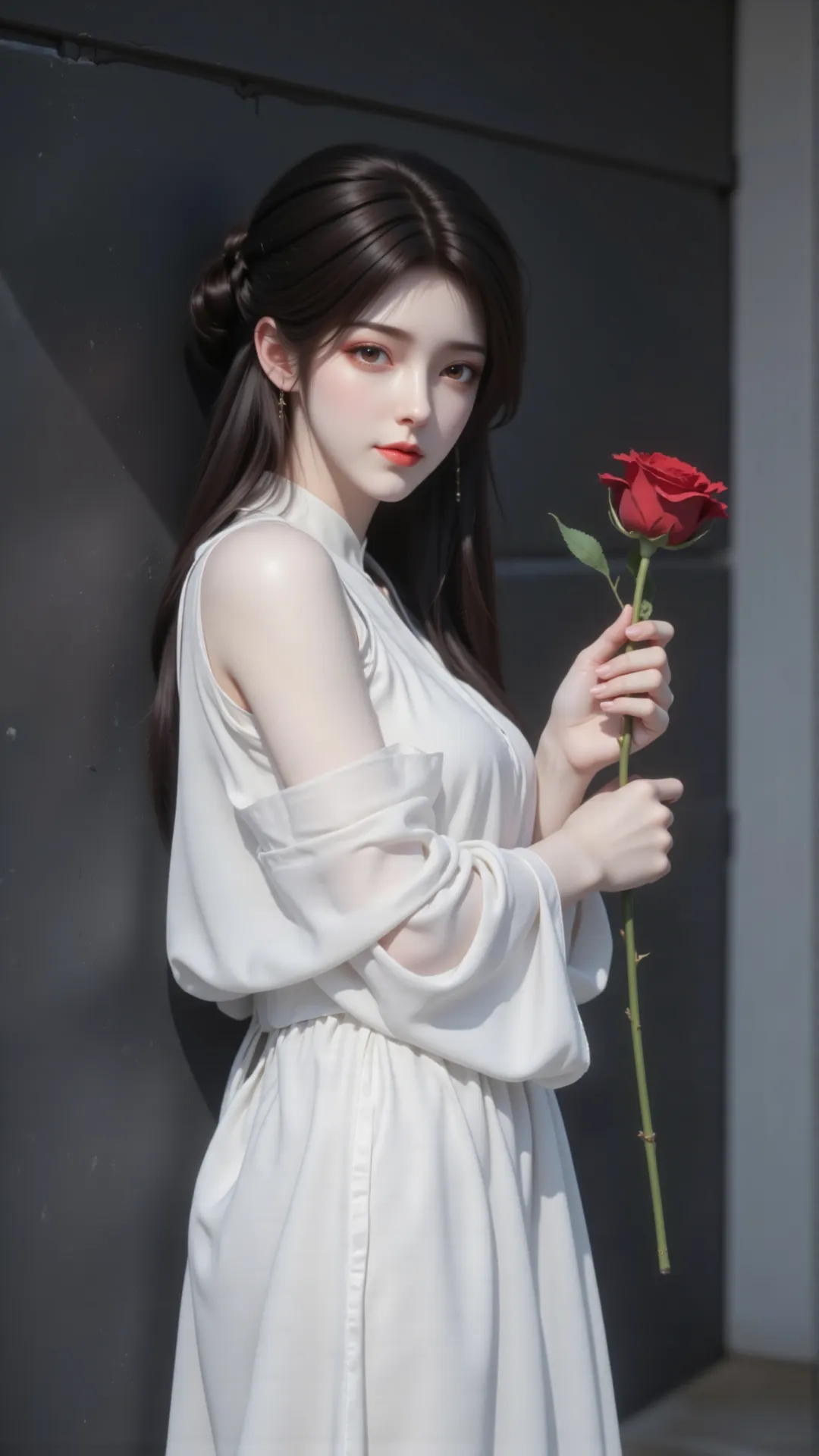 昔日于石村初遇,娇俏灵动,笑靥如阳,暖了少年征途;待经岁月淬炼,更添清绝风骨,静时如冷月悬峰,清冷孤高,远观而不可亵玩;动时若烈焰燎原,热烈张扬,尽显万种风情。手中红玫,恰似她半生炽热,于素白衣衫间绽放,如她于乱世之中,以一身傲骨,守一份初心。