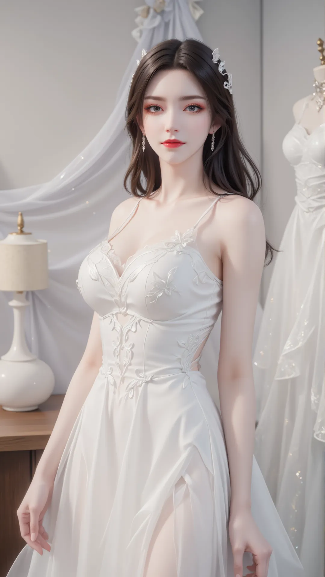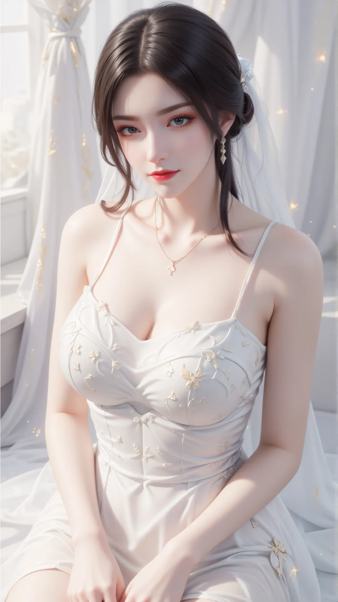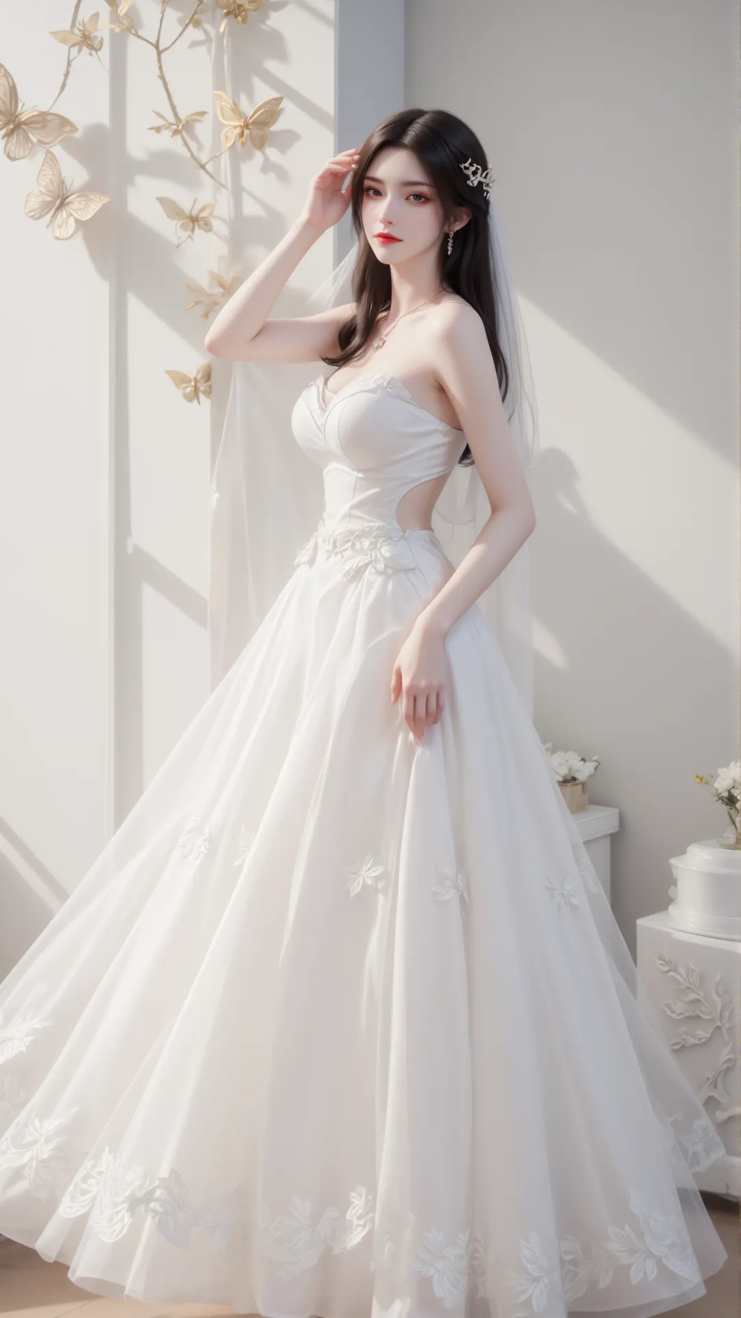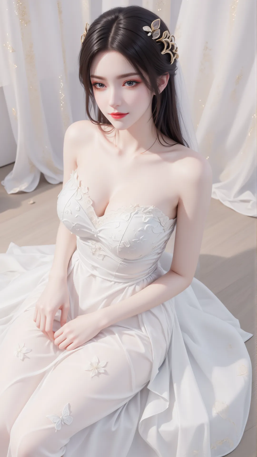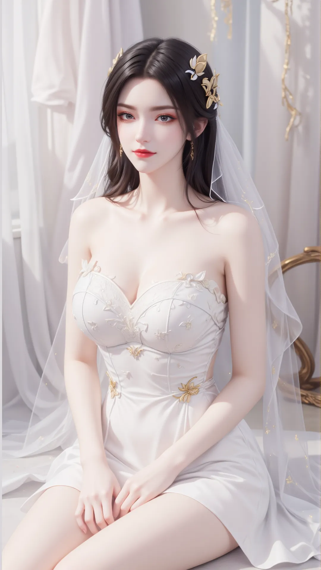 暖光漫过纱帘,白裙曳地如流云,美杜莎静坐其间,恍若蛇族女王着素妆,踏月而来。抹胸婚纱缀以蝶纹花绣,衬得雪肌胜玉;白纱轻笼肩头,金饰发簪映着柔光,漾出细碎流光。那双眼眸,是淬了寒星的琉璃,藏着蛇人族的冷冽霸气,又含着人间风月的温柔缱绻,一眼望去,便叫满室生香,山河失色。