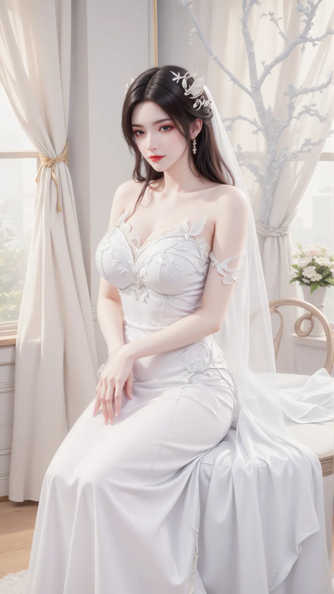 晴光漫过窗棂,纱帘轻摇,美杜莎斜倚而坐,鱼尾婚纱勾勒玲珑身段,蝶纹绣饰添了几分灵动,白纱轻覆发间,每一寸轮廓都恰到好处,每一个眼神都摄人心魄。她静靠椅上,素手轻搭膝头,将蛇族的冷冽与人间的温情,融成了独属于自己的风骨。