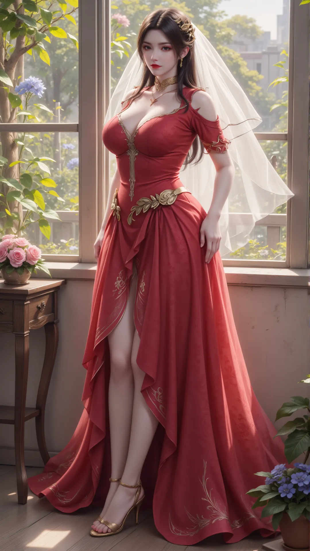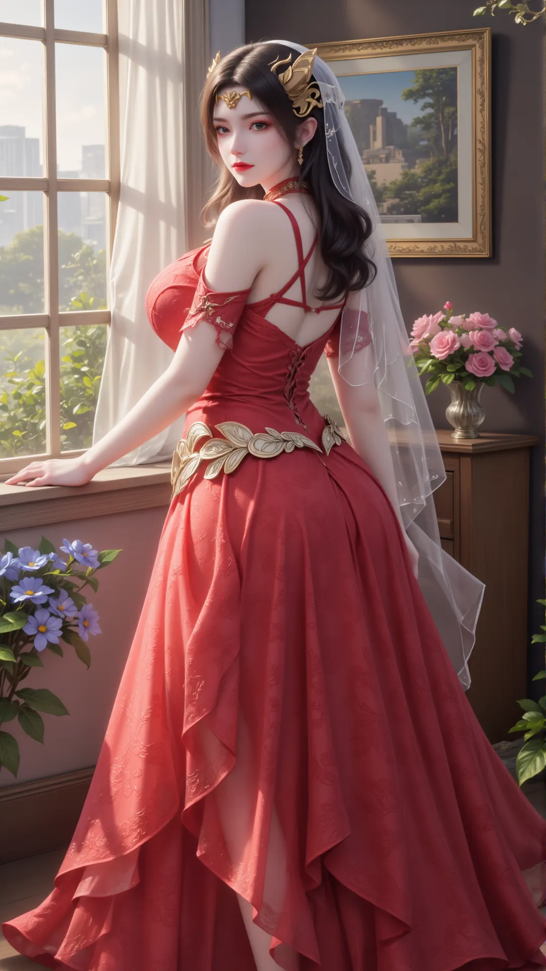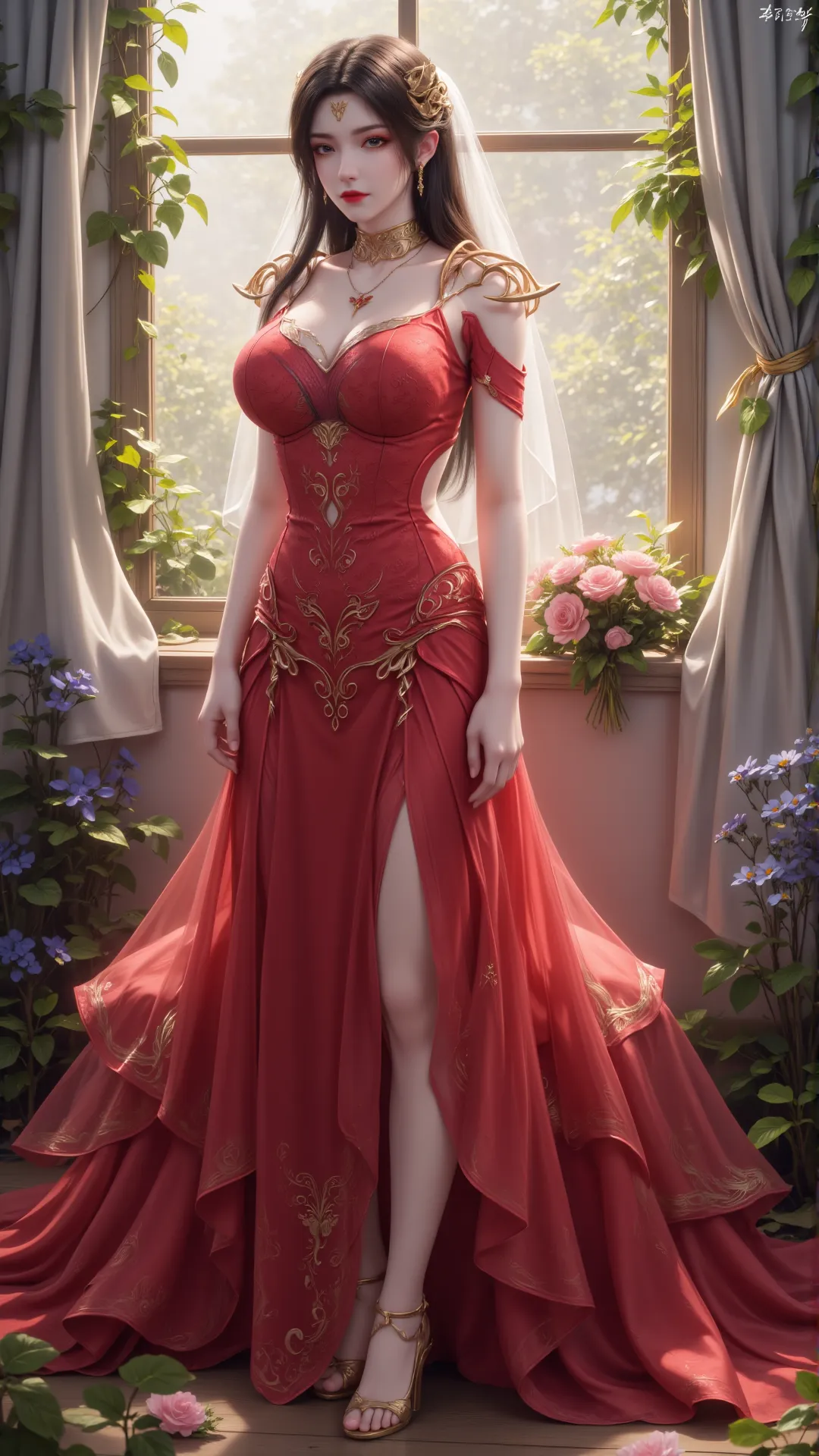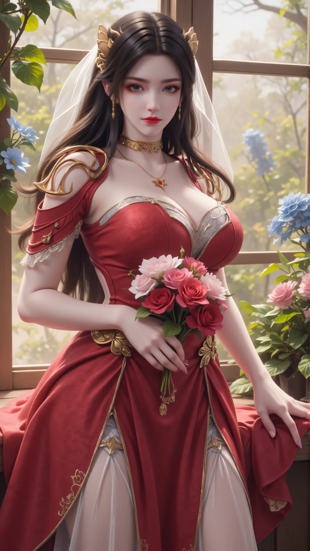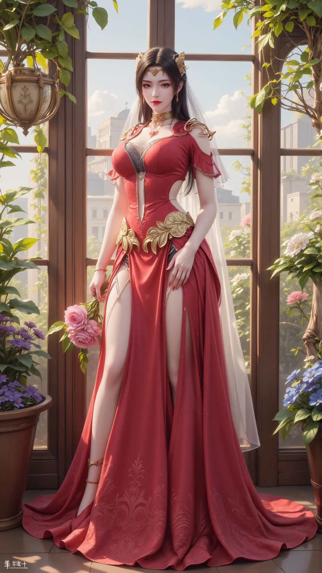 暖光漫过窗棂,花影轻摇,美杜莎斜倚而坐,红裙勾勒玲珑身段,金饰缀满衣间,白纱轻覆发间,每一寸轮廓都恰到好处,每一个眼神都摄人心魄。她手捧花束,粉玫映着玉容,将蛇族的冷冽与人间的温情,融成了独属于自己的风骨。