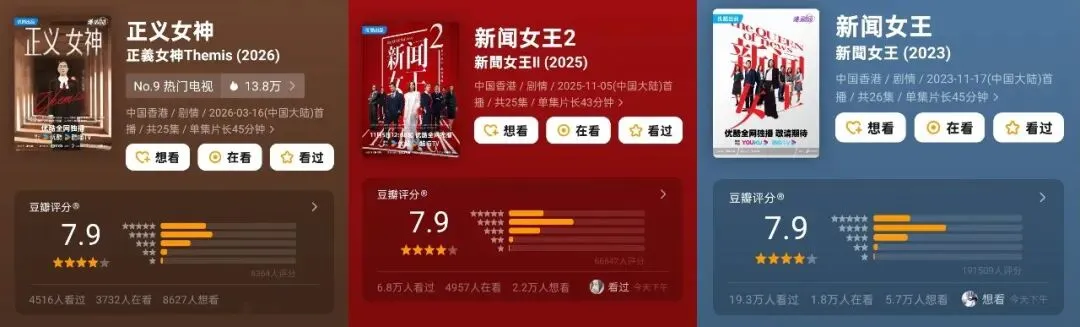 《新闻女王》与《正义女神》虽然题材不同,但内核相通。前者讲的是媒体行业里依然有人在坚守职业理想,后者讲的是司法体系里有人在默默守护着每一个需要被保护的人。两部剧共同的底色,是对坚守的礼赞,是对人性善意的肯定。这是新港剧一直想传递的价值观。