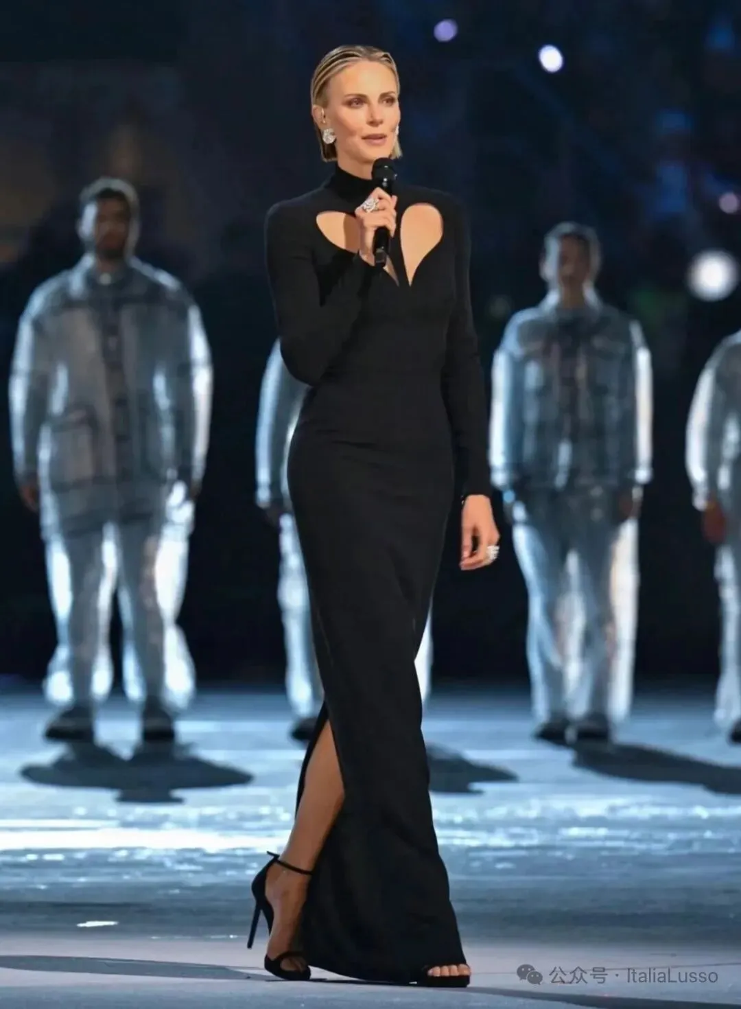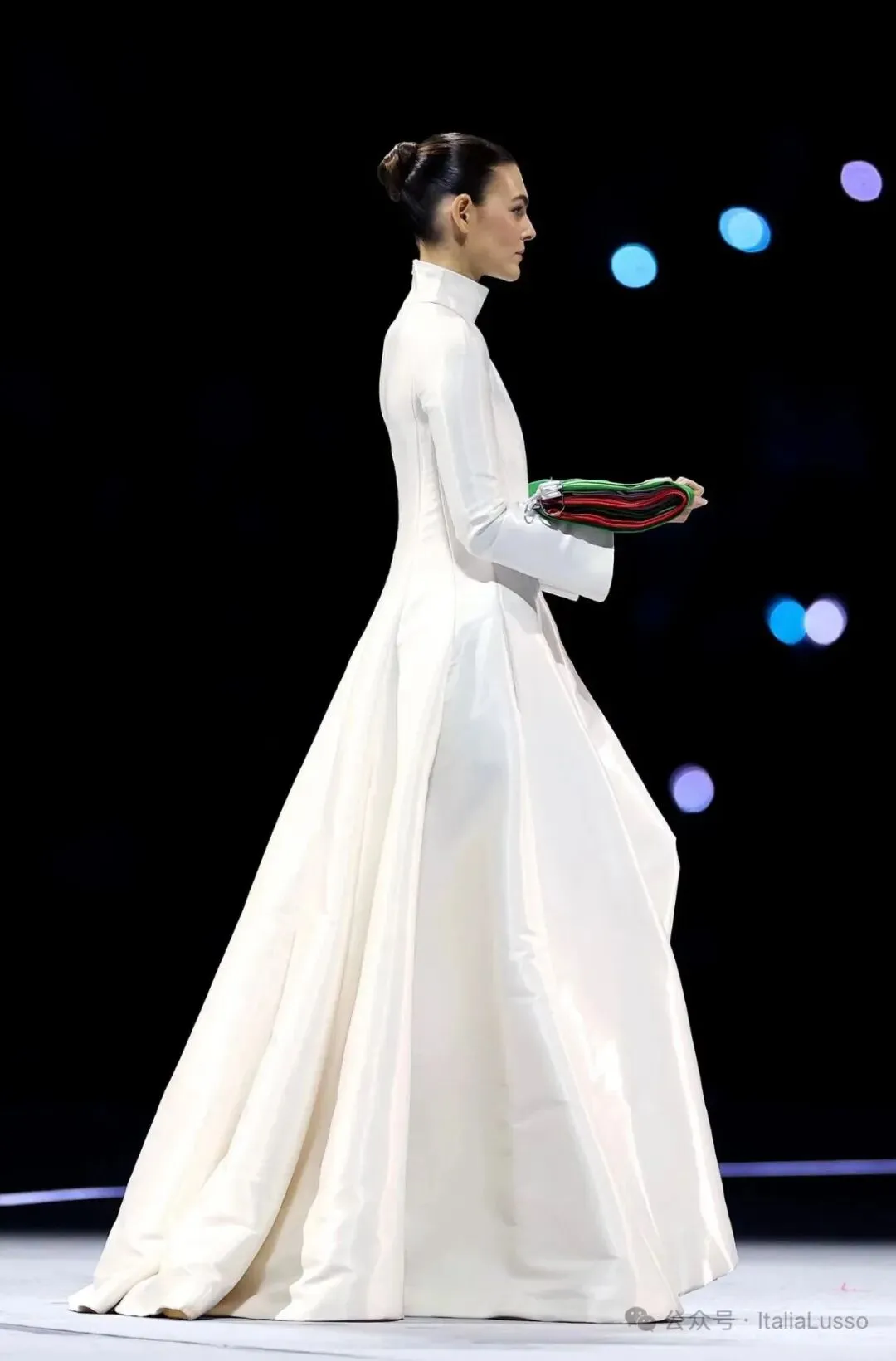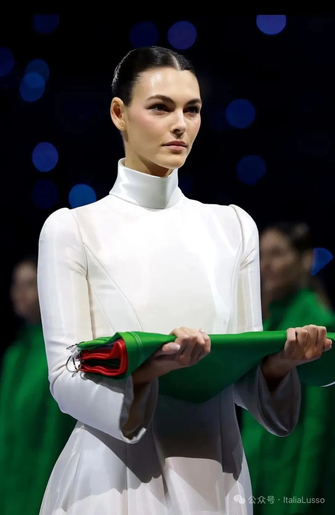 全球瞩目下,Vittoria Ceretti穿着Giorgio Armani特殊面料的定制礼服护送国旗入场交接