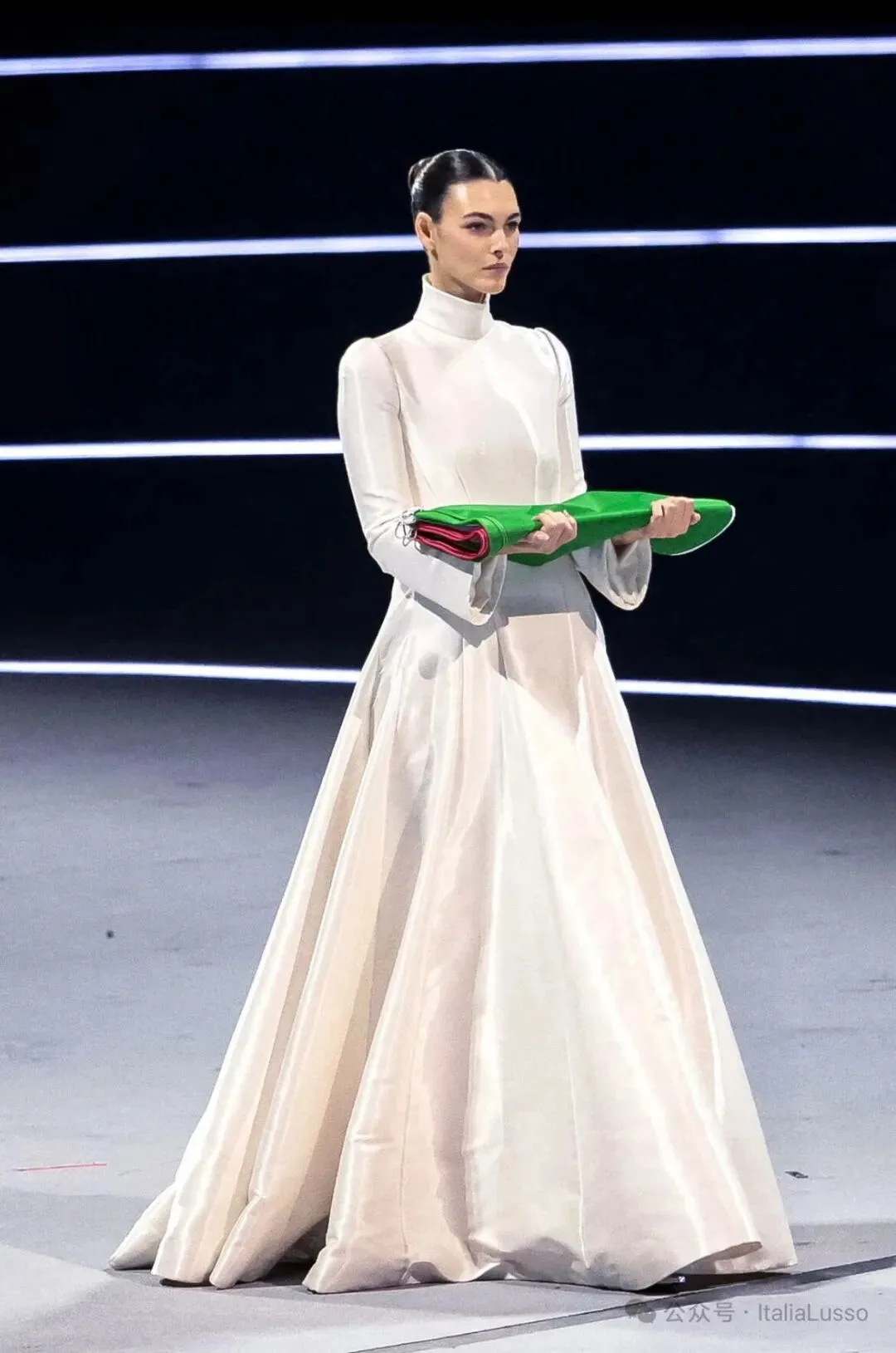 压轴交接国旗的Vittoria Ceretti, 每一步都庄重优雅,散发出满满的意式美学感。