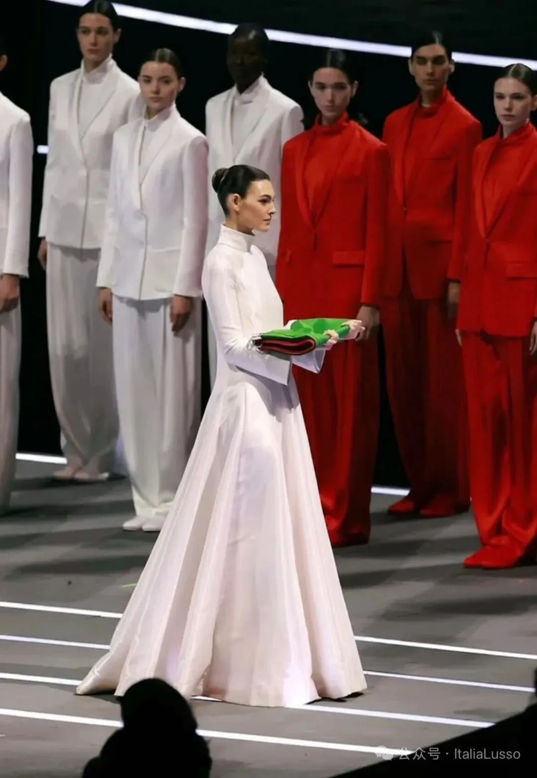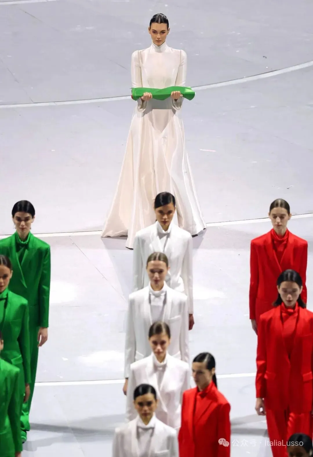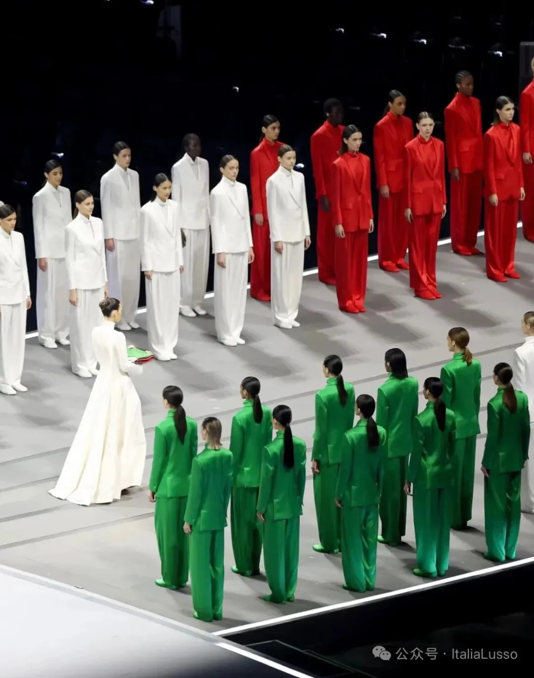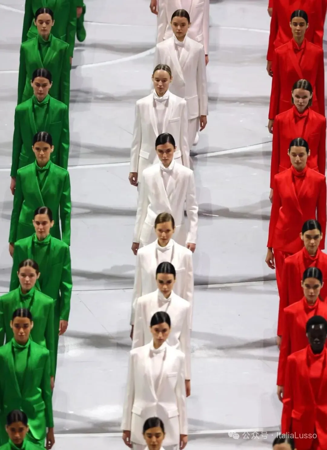 米兰冬奥会开幕式这场视觉盛宴让你印象最深的是不是这个国旗方阵,60位超模身着意大利时尚品牌乔治阿玛尼Giorgio Armani设计的意大利国旗三种颜色的纯色西服套装,以走秀的形式组成意大利国旗。