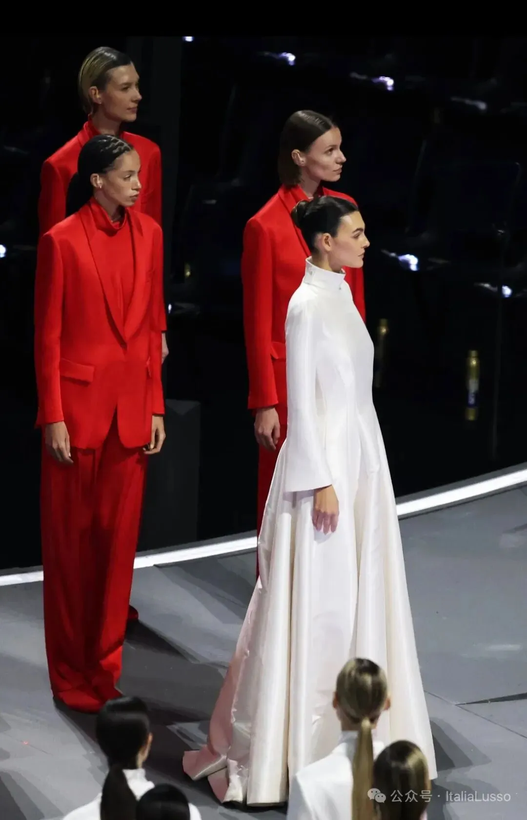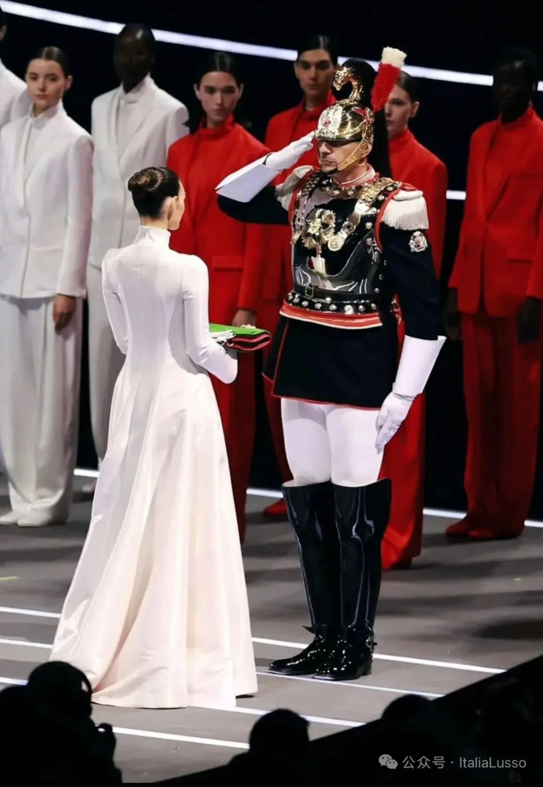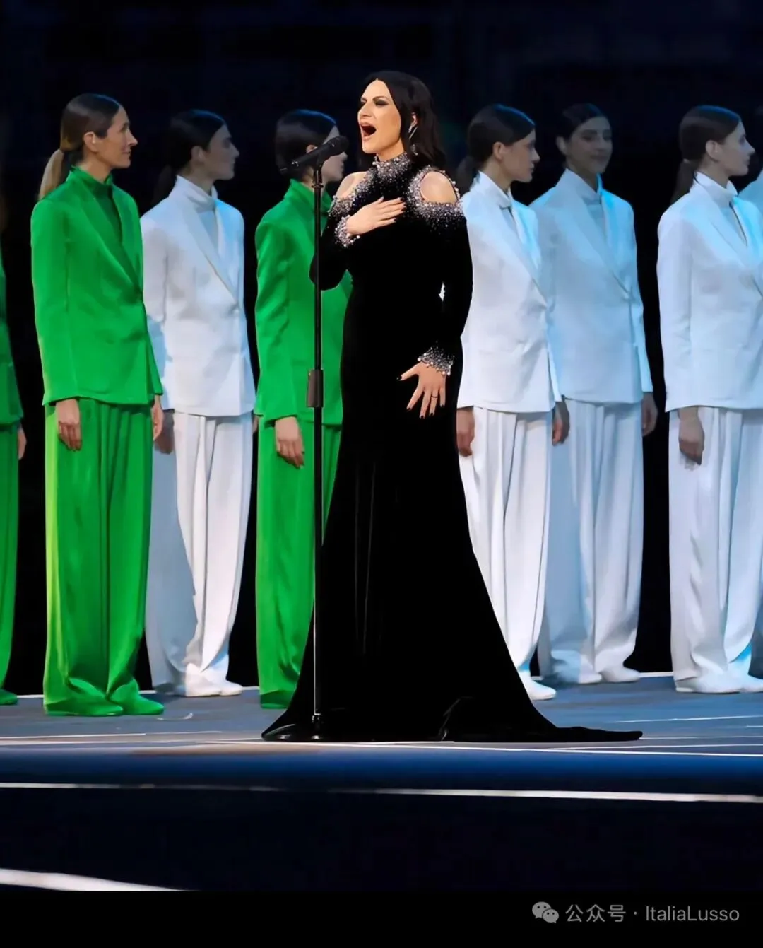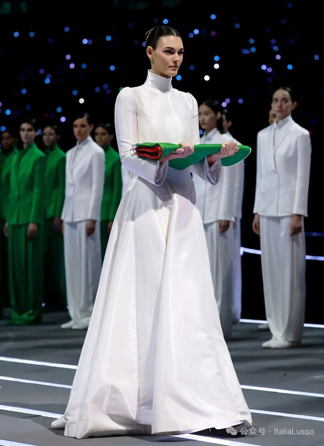 米兰冬奥会开幕式这场视觉盛宴让你印象最深的是不是这个国旗方阵,60位超模身着意大利时尚品牌乔治阿玛尼Giorgio Armani设计的意大利国旗三种颜色的纯色西服套装,以走秀的形式组成意大利国旗。