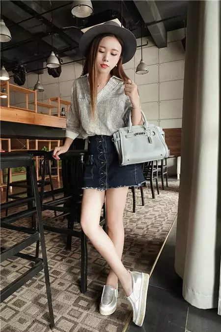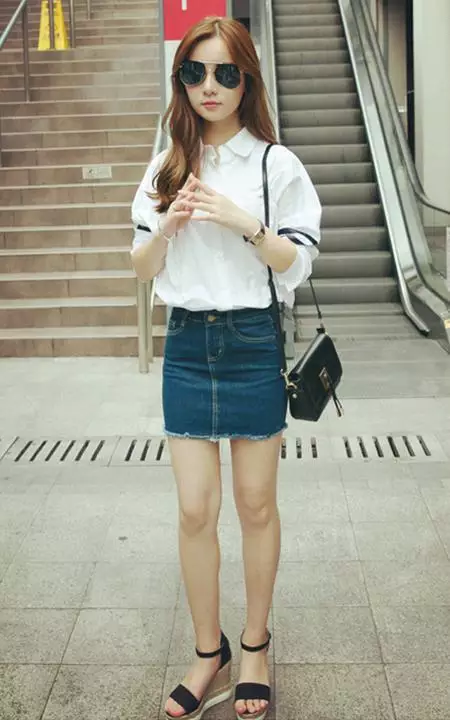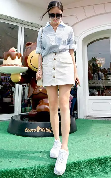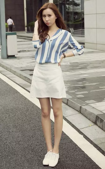 蓝色细条纹衬衫搭配紧身包臀白色牛仔裙穿上一双运动休闲鞋,整体营造出十足的小女人味,特别清新。
