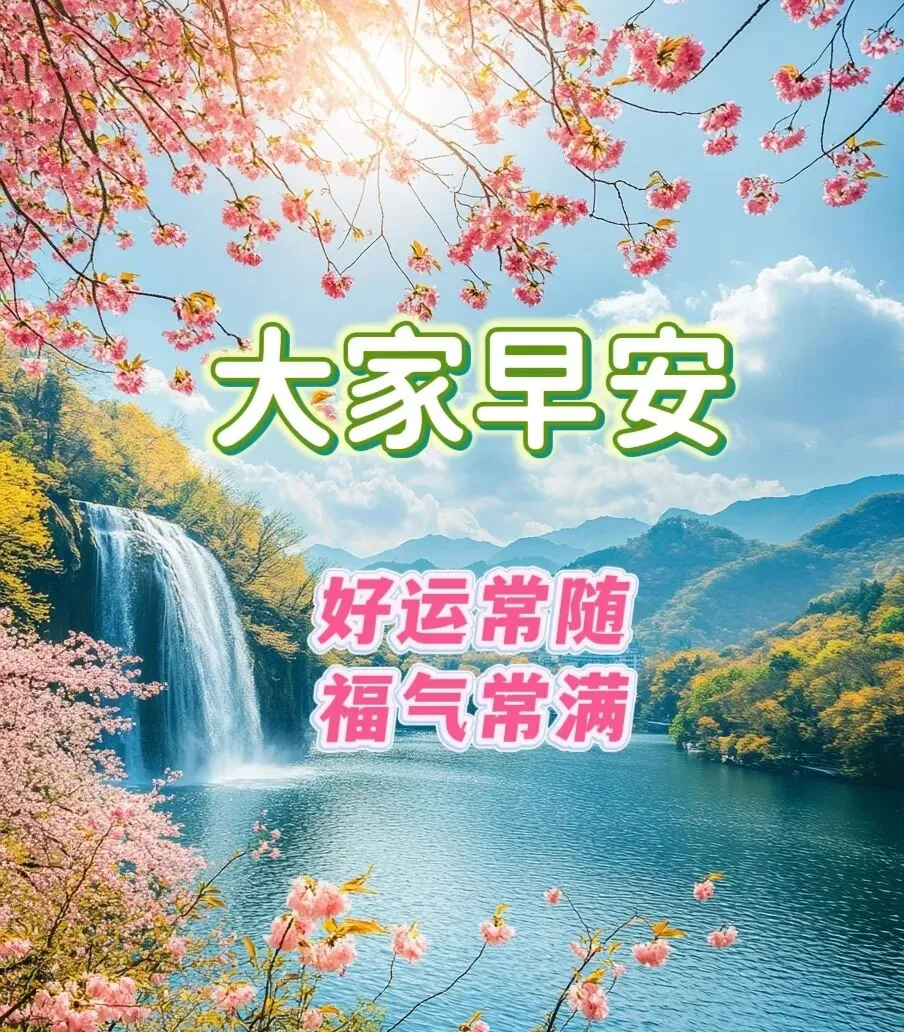 亲情如山,好友如水,依山傍水,人生完美。牵挂是情,祝福是意,每天问候,心甜如蜜。早上好,新的一天吉祥如意,平安顺心!