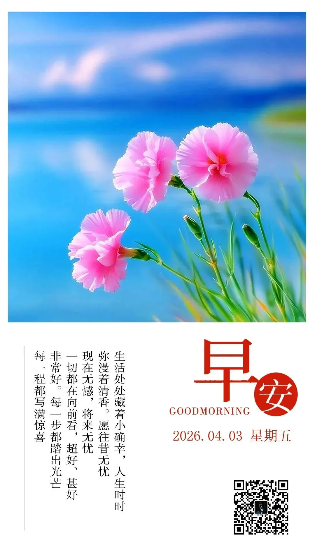 当前位置:首页>美女资讯>4月3日早安心语祝福图片:生活处处藏着小确幸,人生时时弥漫着清香.愿往昔无忧,现在无憾,将来无忧.