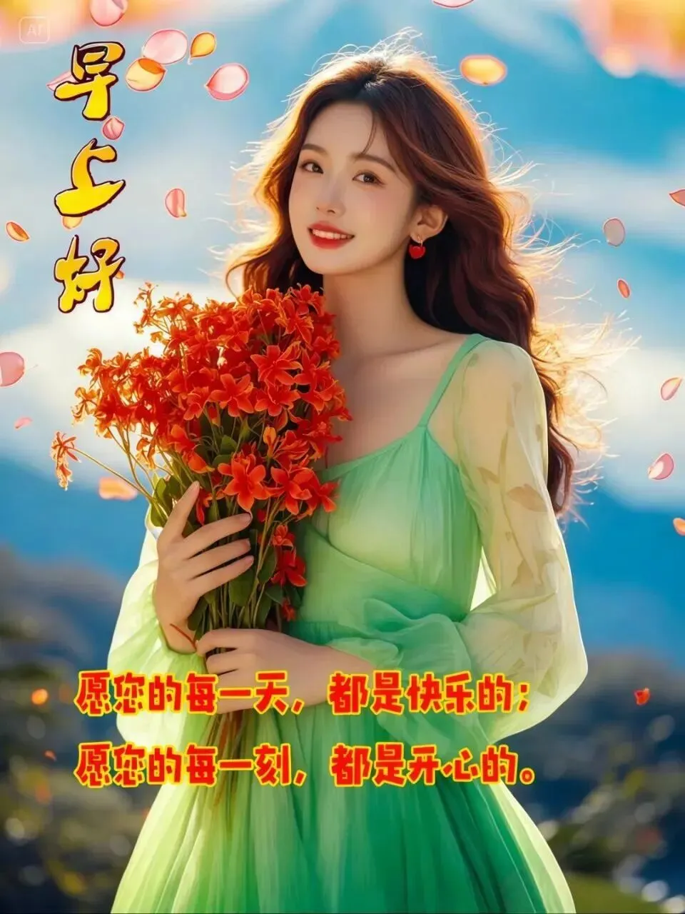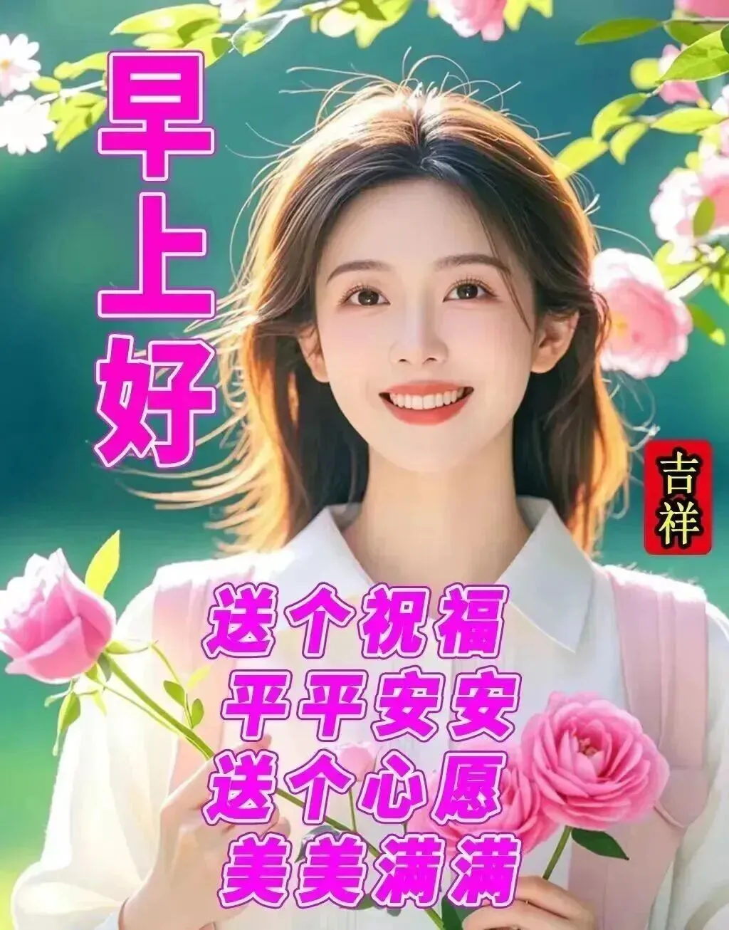 一句早安,万千祝福,顺心愉快、吉祥安康!借一缕清风,让你抖擞精神;借一米阳光,让你温暖心房;借一句吉言,给你一生幸运,早安!