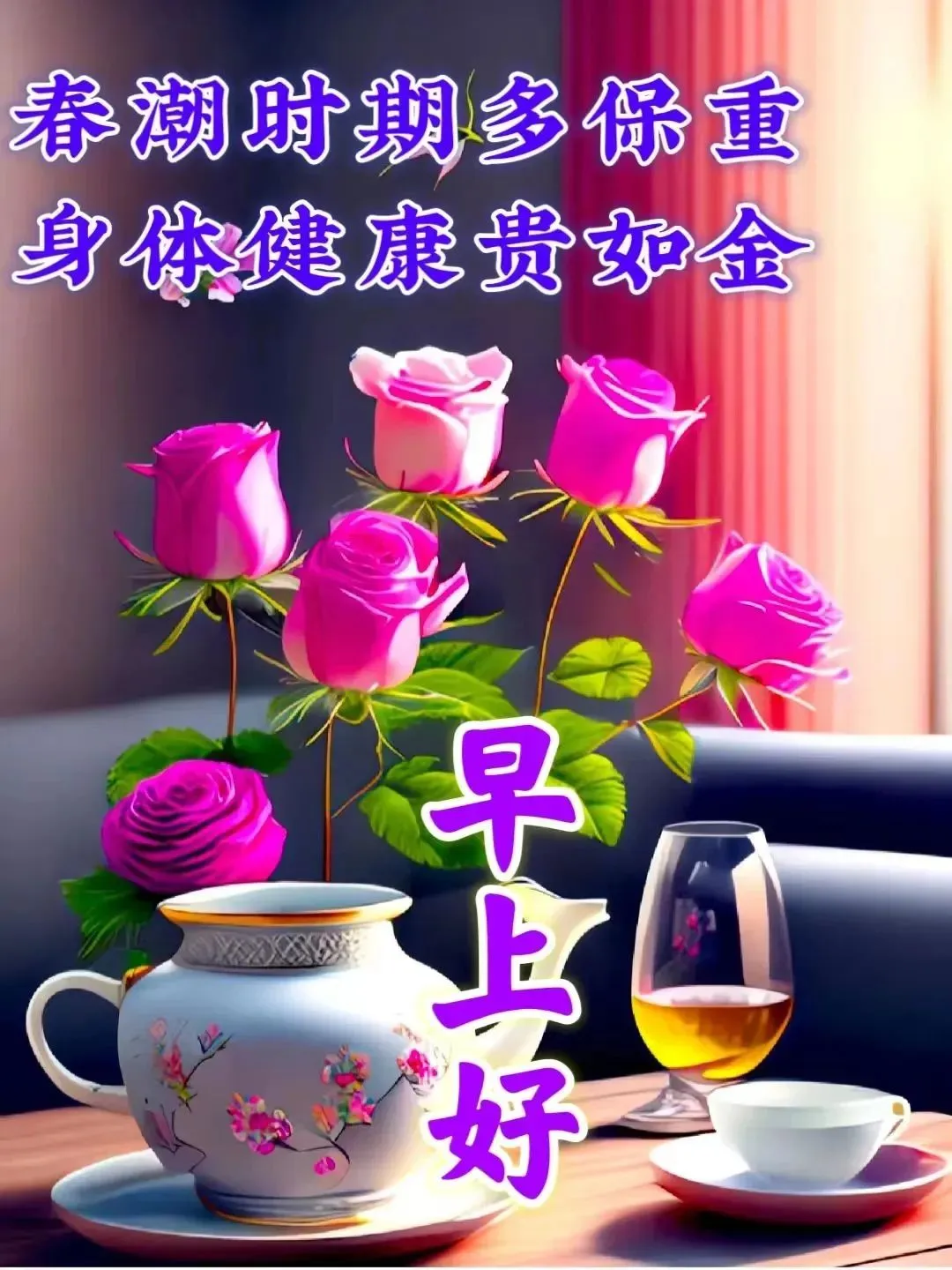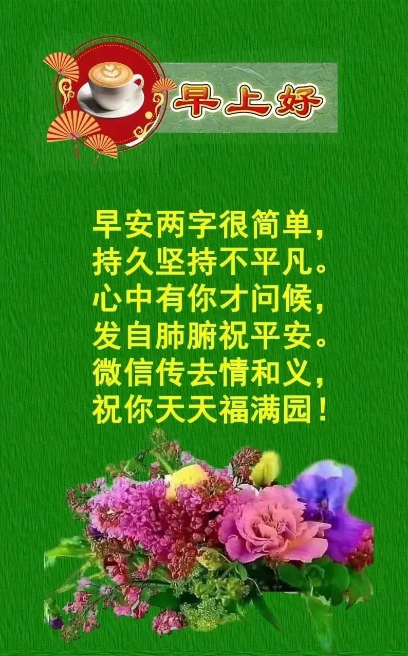 11、清晨的雨露清澈透明,多事的蝉儿热闹的鸣唱,欢快的喜鹊掩饰不住心中的喜悦,可人的小麻雀也叽叽喳喳,原来你醒了,轻轻的问候一声:祝你早安开心一整天。