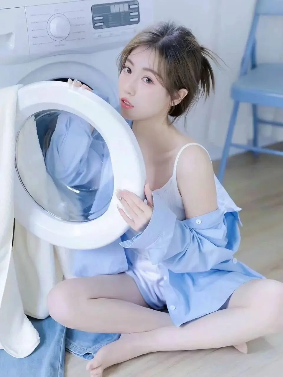 洗衣机旁的清新女神:慵懒风尽显纯欲魅力
