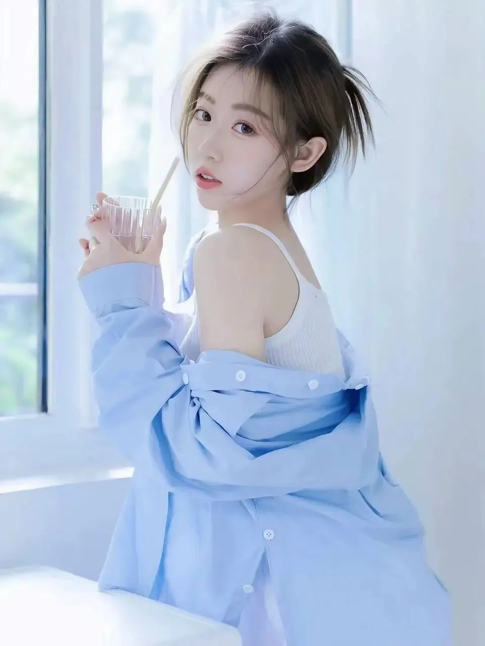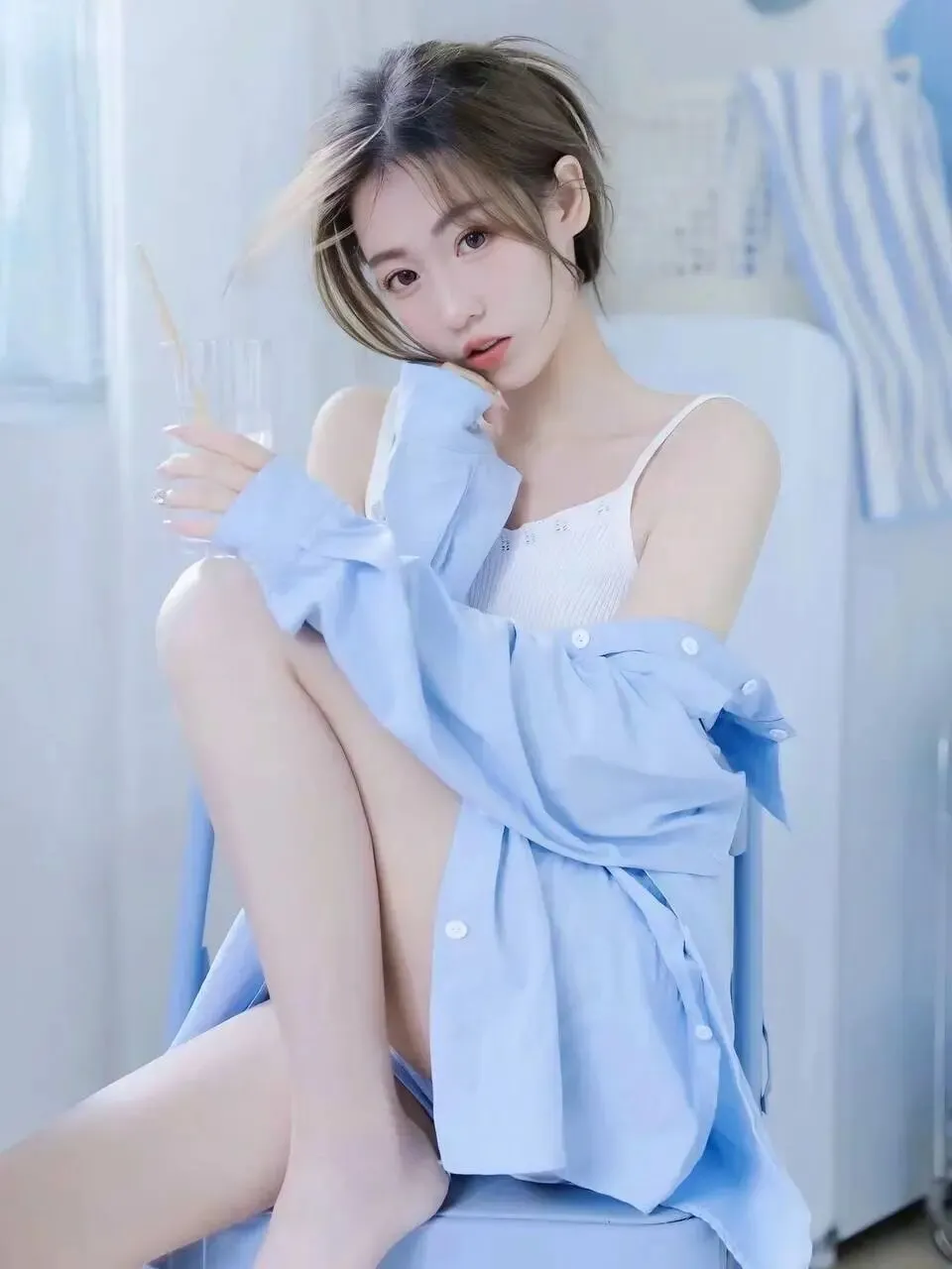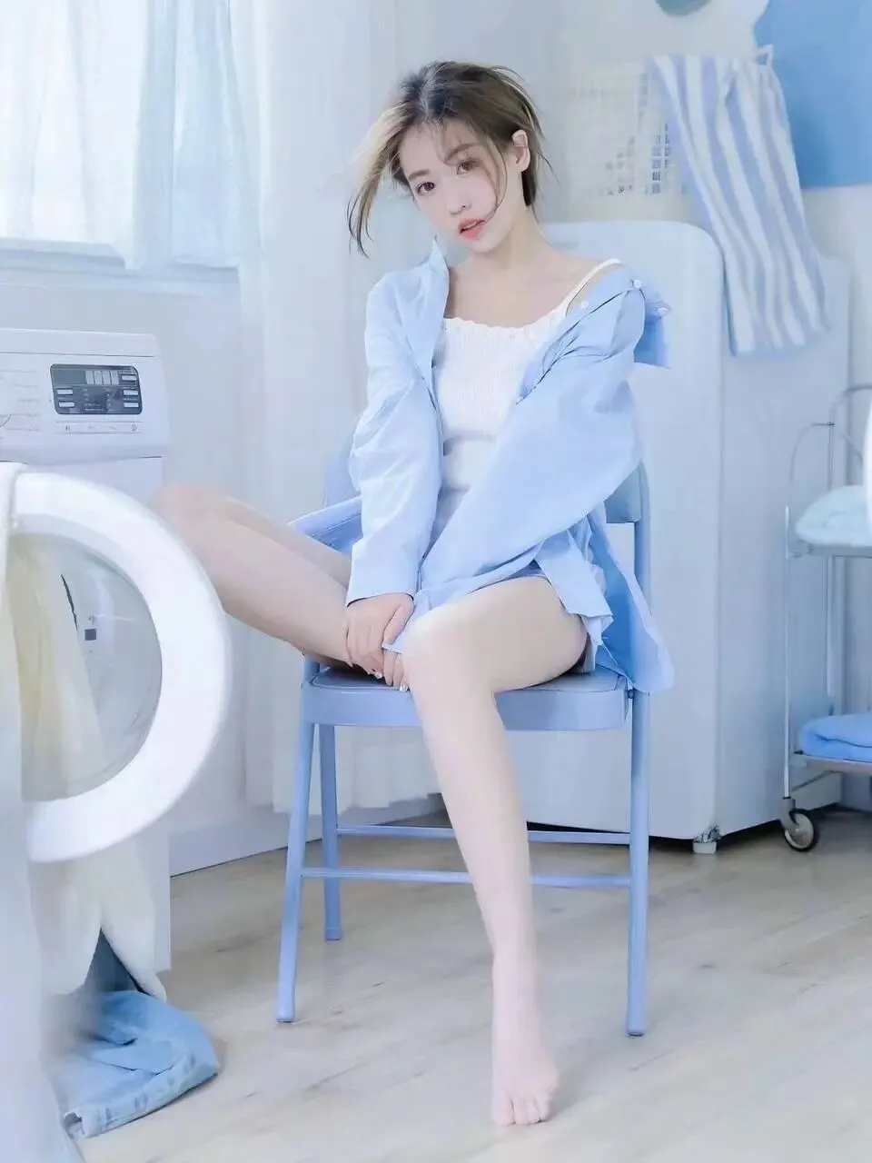 她穿着一件宽松的浅蓝色衬衫,衬衫的领口微微敞开,露出里面一件简约的白色吊带背心,衬衫的袖子随意地卷起,露出纤细的手腕。她的双腿修长,赤足踩在冰凉的地板上,一只脚轻轻搭在另一只脚上,姿态慵懒而随性。她的头发被随意地扎成一个高马尾,几缕碎发垂落下来,拂过她白皙的脸颊,为她增添了几分不经意的妩媚。