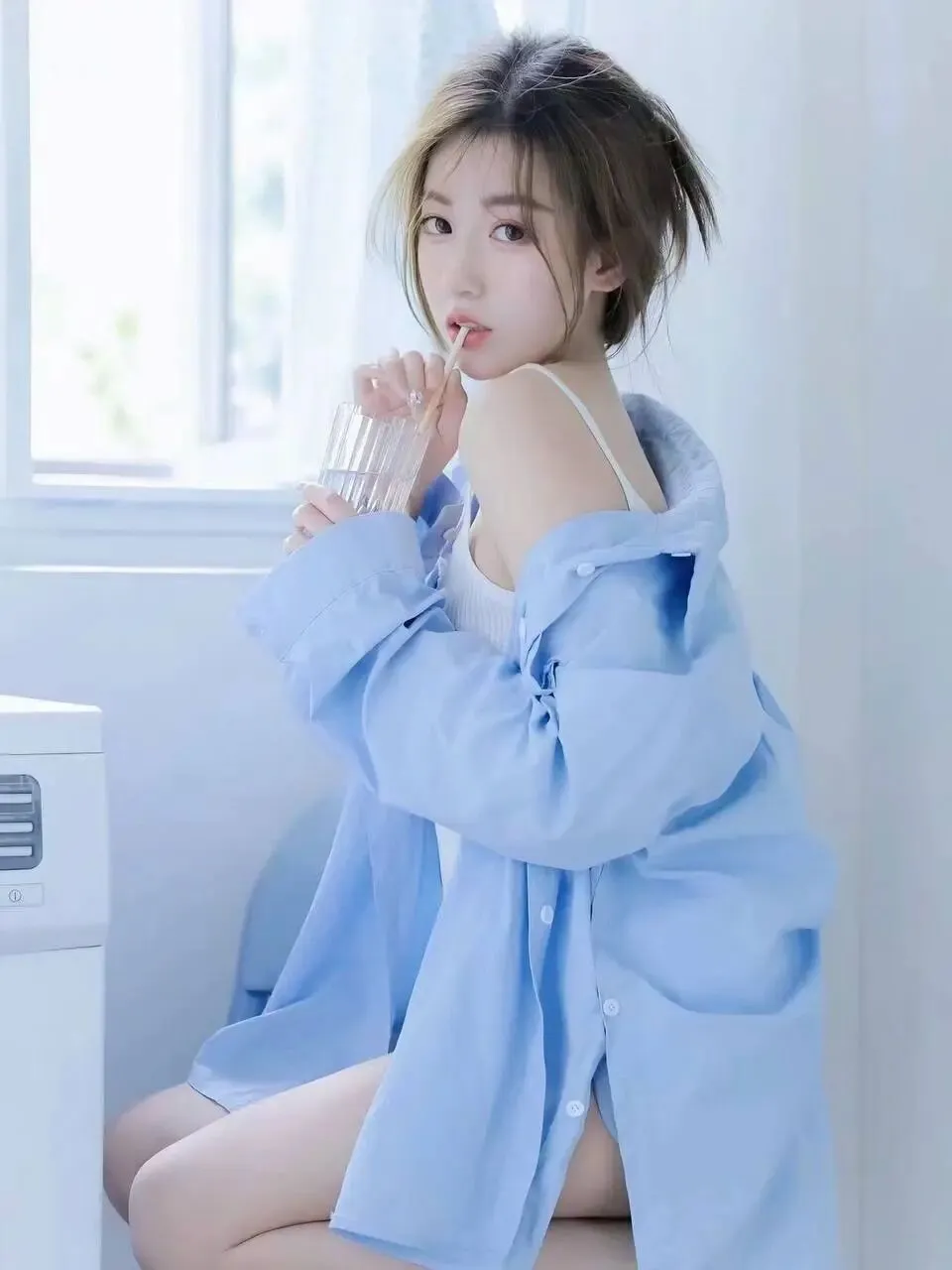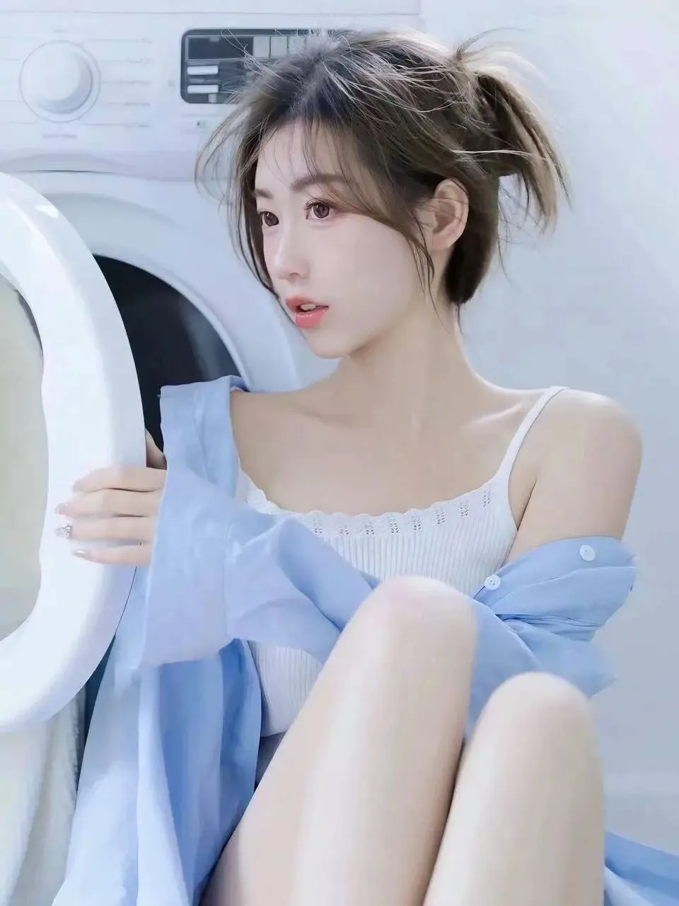 洗衣机旁的空气里弥漫着一种特别的氛围,那是一种清新与慵懒交织,纯真与欲望并存的微妙气息。在这不大的空间里,阳光透过半开的窗户,洒在洁白的墙壁与地板上,形成斑驳的光影,为这日常的一幕添上了一抹梦幻的色彩。而她,就坐在那台崭新的洗衣机旁,仿佛是这光影中最灵动的笔触,勾勒出一幅令人心动的画面。