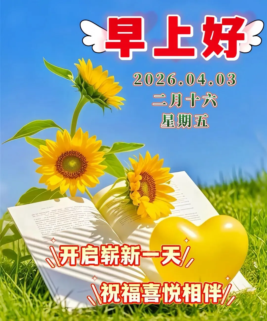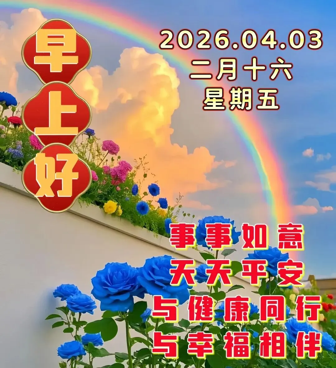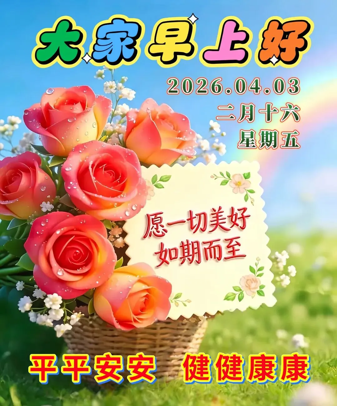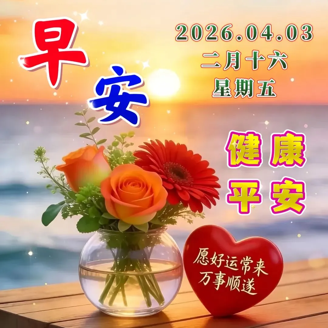 今天是4月3日,🌅红日冉冉升起,💕万物缓缓苏醒,🌷问候如约而至,🎄送上真挚心意,💝时时开开心心,🌸天天平安好运,🌞永远健康幸福!💐大家早上好!🍑