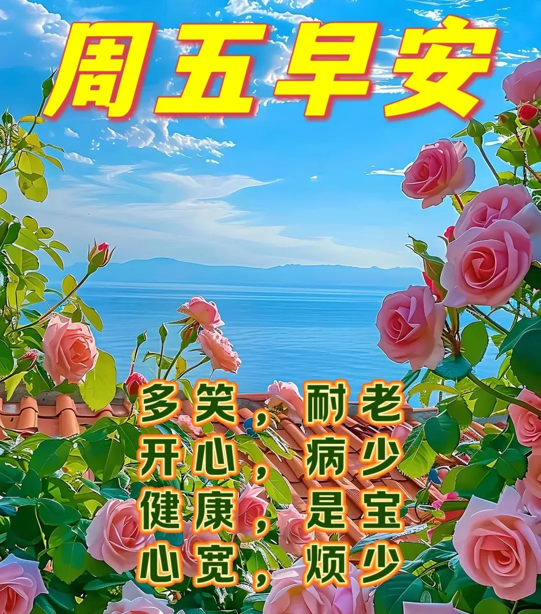 🌊问候,是最质朴的心意;💖平安,是最长久的牵挂;🌺健康,是最珍贵的福气;💕如意,是一直不变的期盼。🍑周五早上好,愿你度过轻松美好的一天!🌅