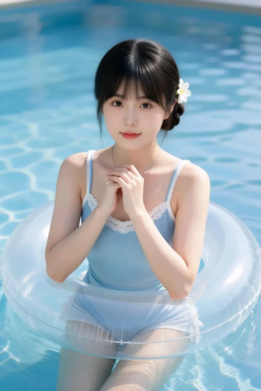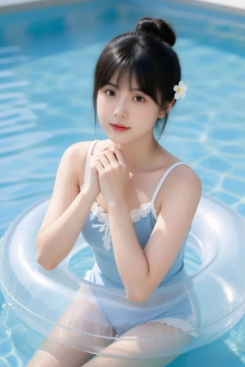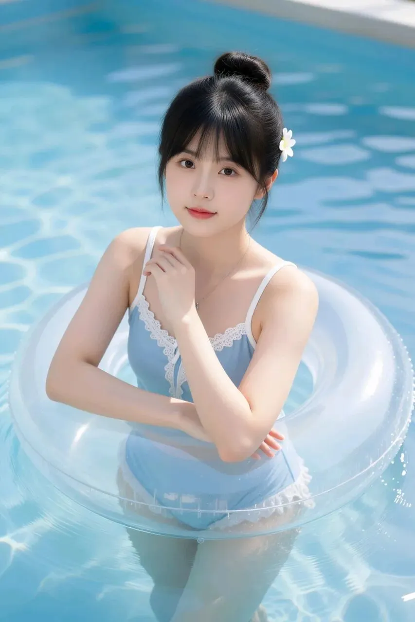 夏日泳池拍照,这件真的很上镜。不用复杂的搭配,发间别一朵鸡蛋花,脖子上戴一条细细的银链子,就够了。泡在清澈的泳池里,阳光打在水面上,波光粼粼的光影落在身上和蕾丝上,随手一拍都好看。靠在透明泳圈上,或者手搭在池边,不用刻意摆表情,那种自然的温柔感自己就出来了。不管是去海边度假,还是室内泳池,这套都能hold住。它不是那种“今年穿完明年就不想碰”的款式,清清淡淡的,什么时候看都觉得顺眼。