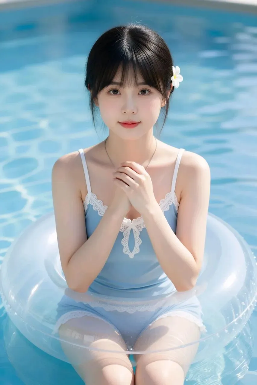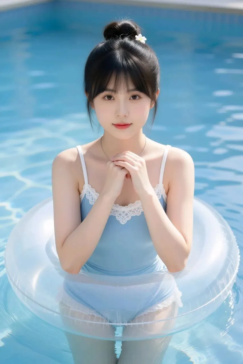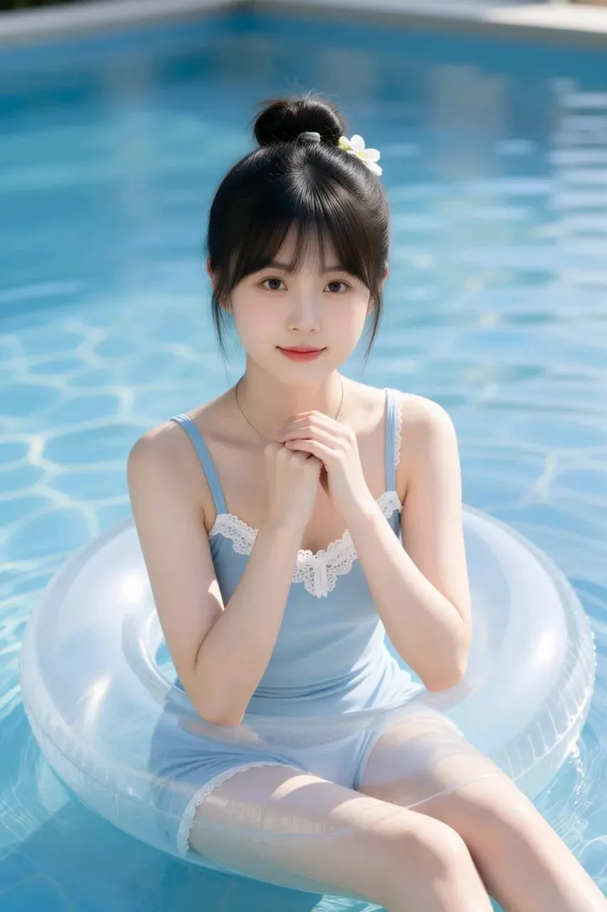 讲真,看到这套泳衣的第一眼,我就觉得“心动”。不是那种很用力的好看,就是清清爽爽的,像夏天下午吹过的一阵凉风。浅蓝色,像泳池里被阳光照透的那片水,领口和肩带加了蕾丝花边,软乎乎的,不夸张。靠在透明泳圈上,泡在水里,连看着的人都觉得凉快。这种松弛又甜美的感觉,真的挺让人向往的。