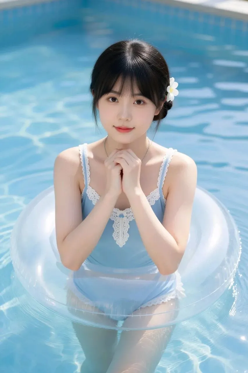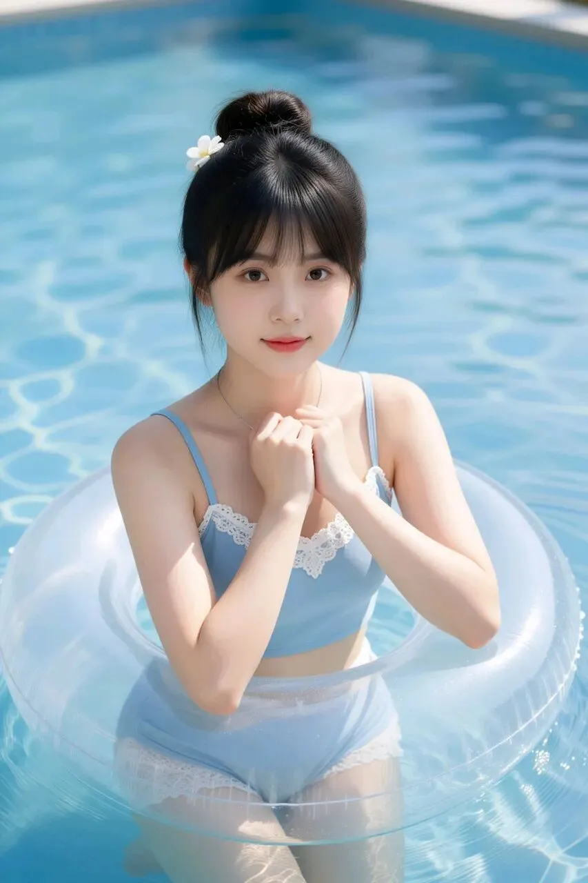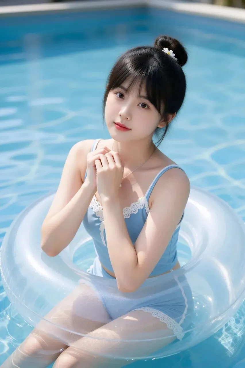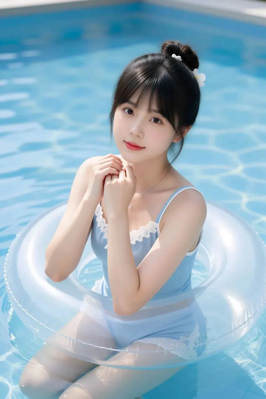 讲真,看到这套泳衣的第一眼,我就觉得“心动”。不是那种很用力的好看,就是清清爽爽的,像夏天下午吹过的一阵凉风。浅蓝色,像泳池里被阳光照透的那片水,领口和肩带加了蕾丝花边,软乎乎的,不夸张。靠在透明泳圈上,泡在水里,连看着的人都觉得凉快。这种松弛又甜美的感觉,真的挺让人向往的。