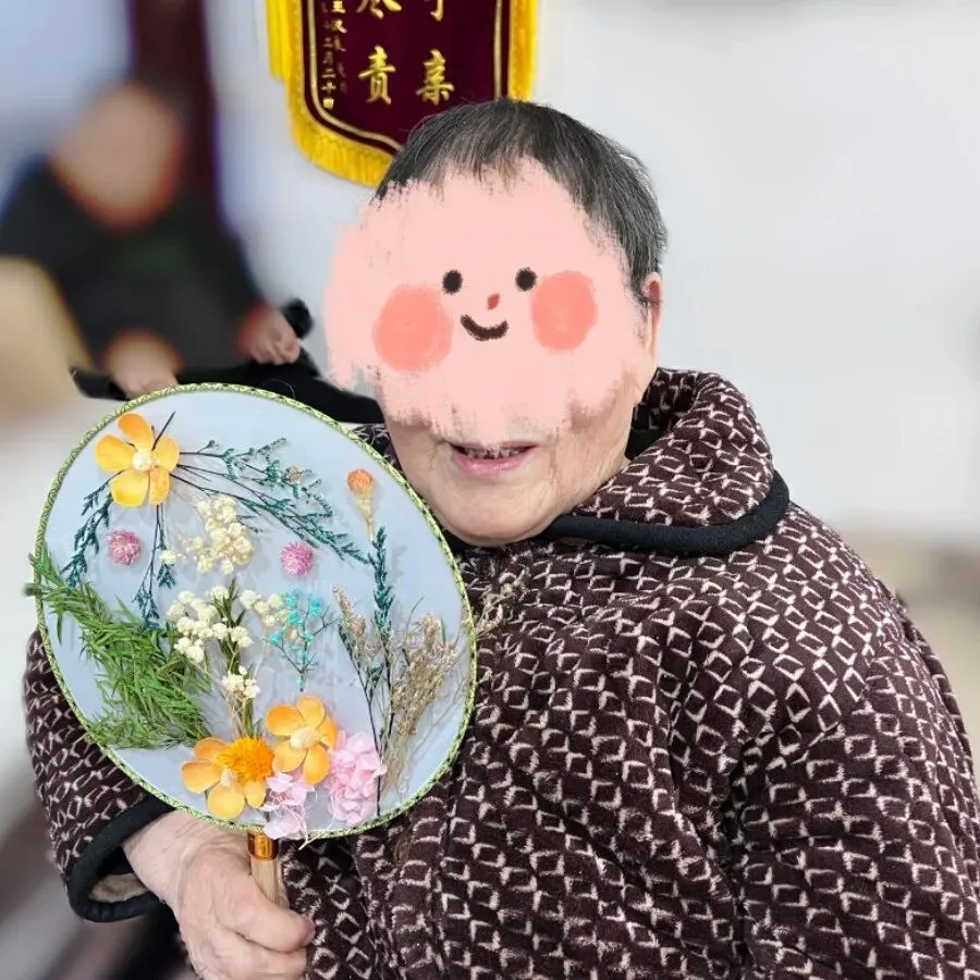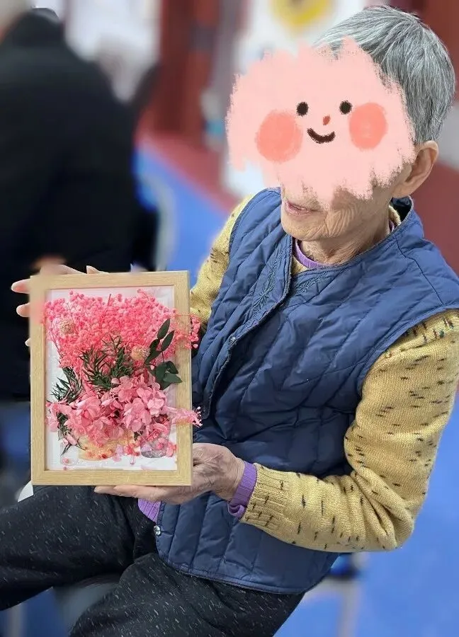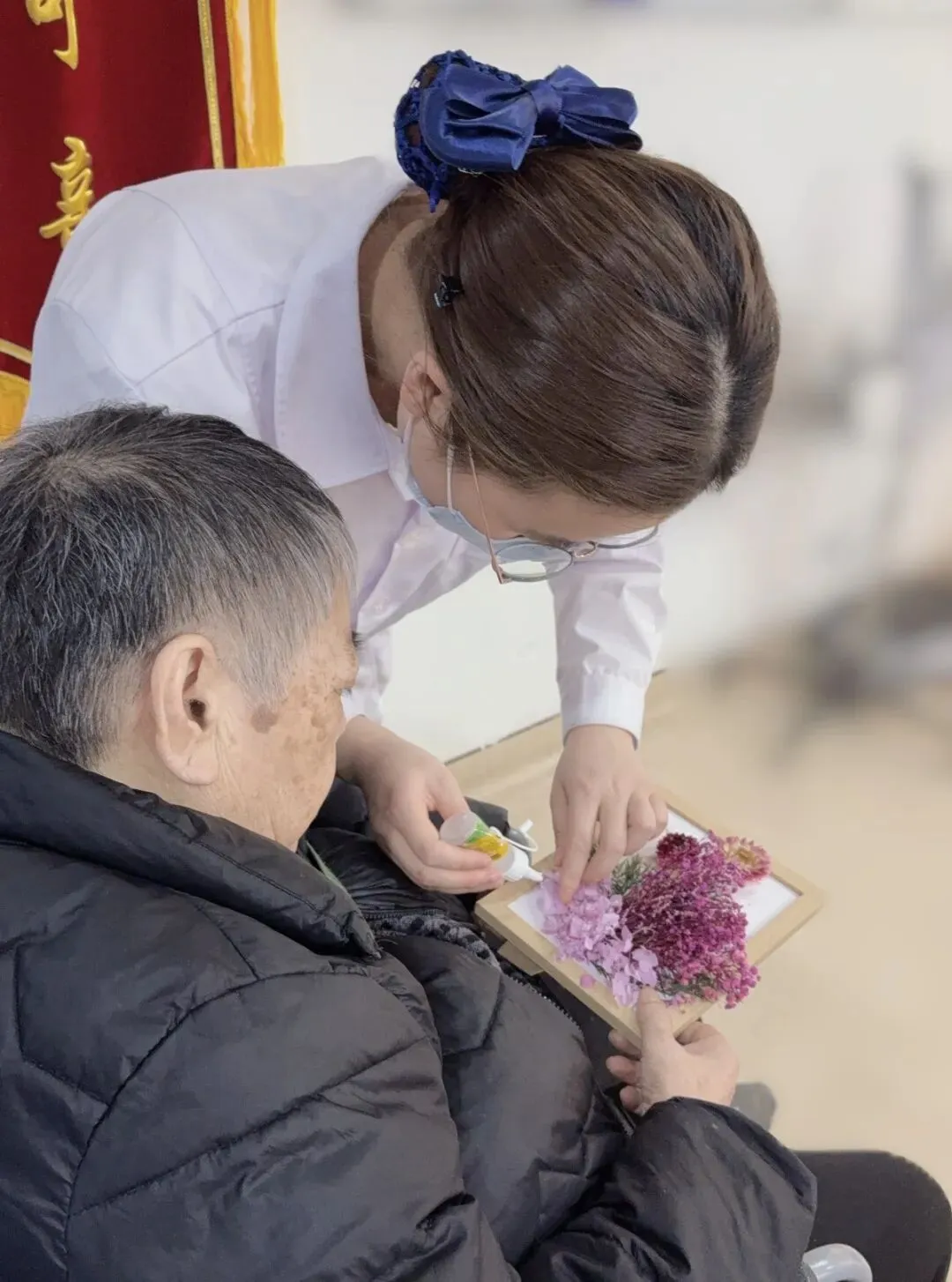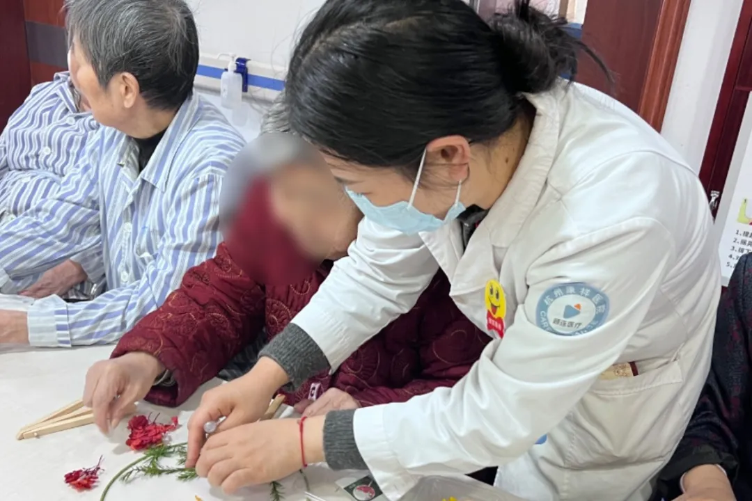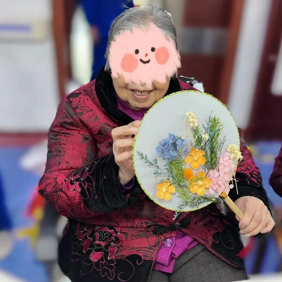 在阿尔茨海默病专区,女患者们也在医护人员的引导下积极参与到活动中。尽管疾病模糊了她们的记忆,但当面对缤纷的干花、精致的扇子和相框时,她们的眼中仍闪过一丝好奇与欣喜。她们每一个动作都仿佛是在与遗忘作斗争,努力抓住此刻的美好。