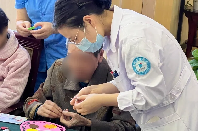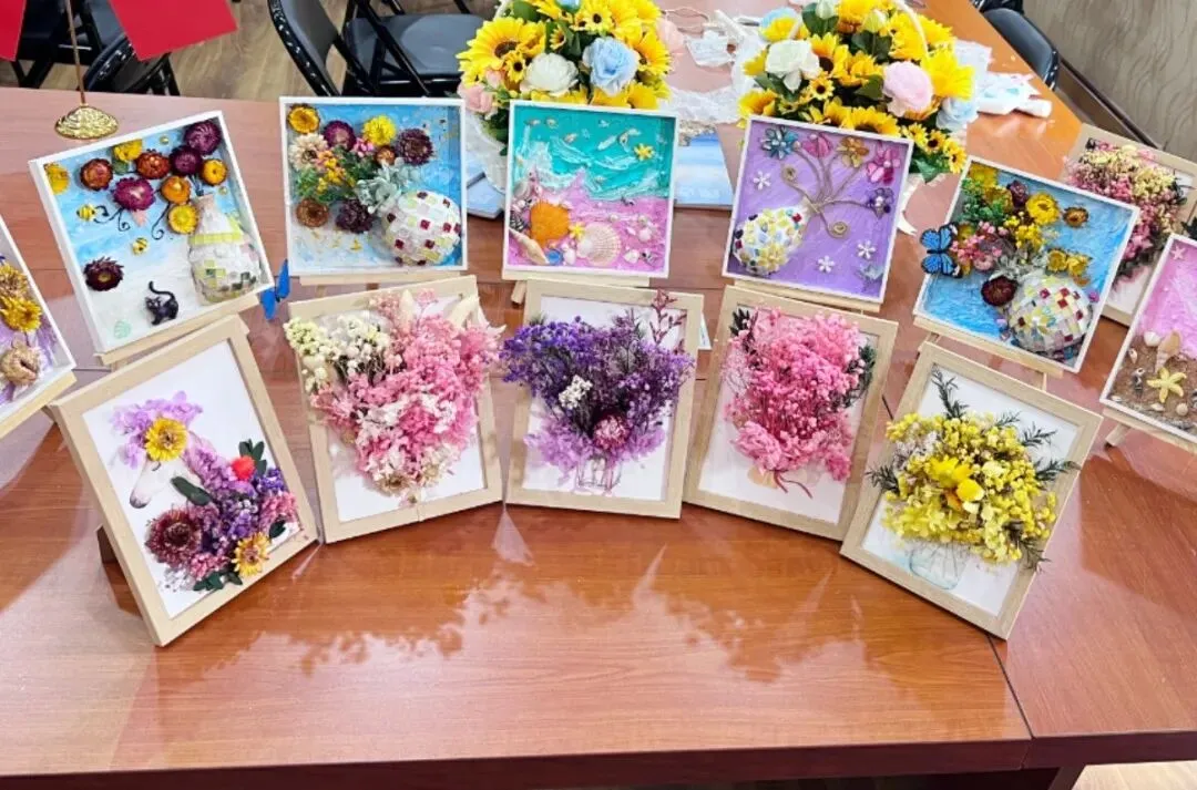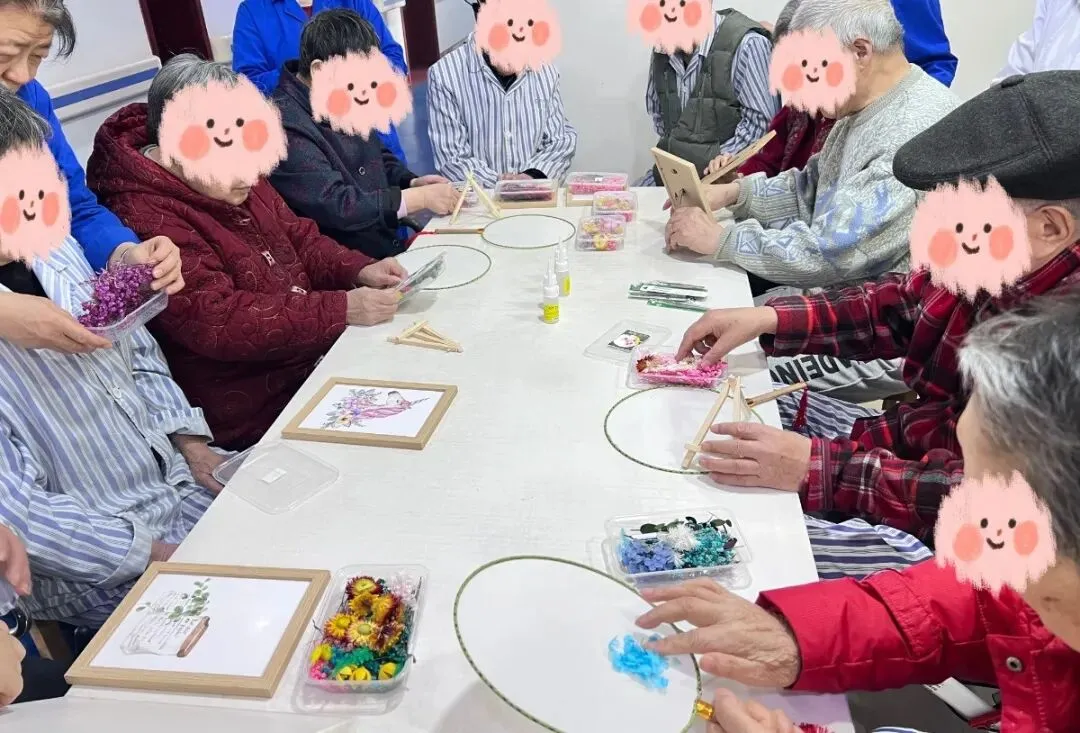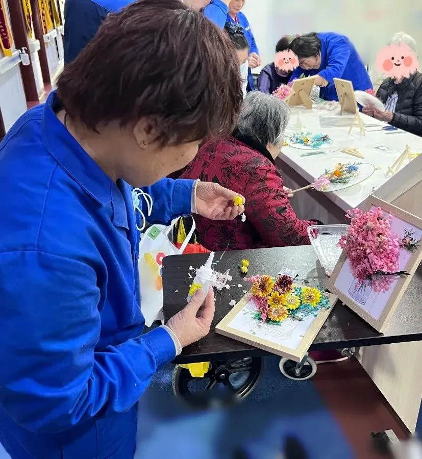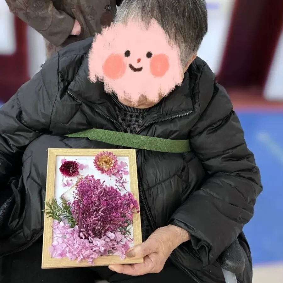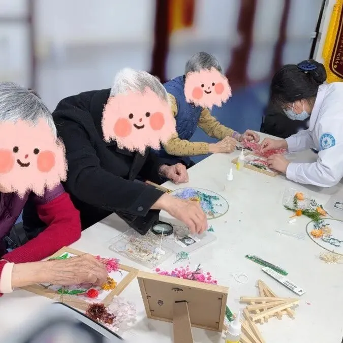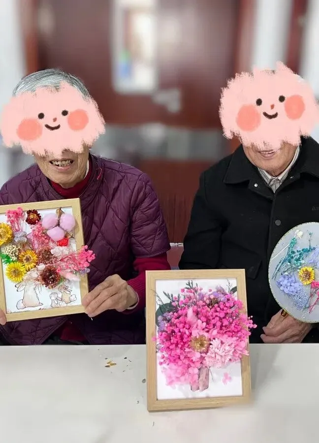 在阿尔茨海默病专区,女患者们也在医护人员的引导下积极参与到活动中。尽管疾病模糊了她们的记忆,但当面对缤纷的干花、精致的扇子和相框时,她们的眼中仍闪过一丝好奇与欣喜。她们每一个动作都仿佛是在与遗忘作斗争,努力抓住此刻的美好。