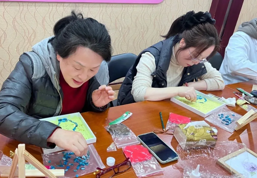 午后的会议室洋溢着欢声笑语。一束束阳光透过窗户洒在她们的脸上。们卸下疲惫,沉浸在DIY手工带来的宁静与愉悦之中。大家围坐在一起,相互交流、相互帮助。